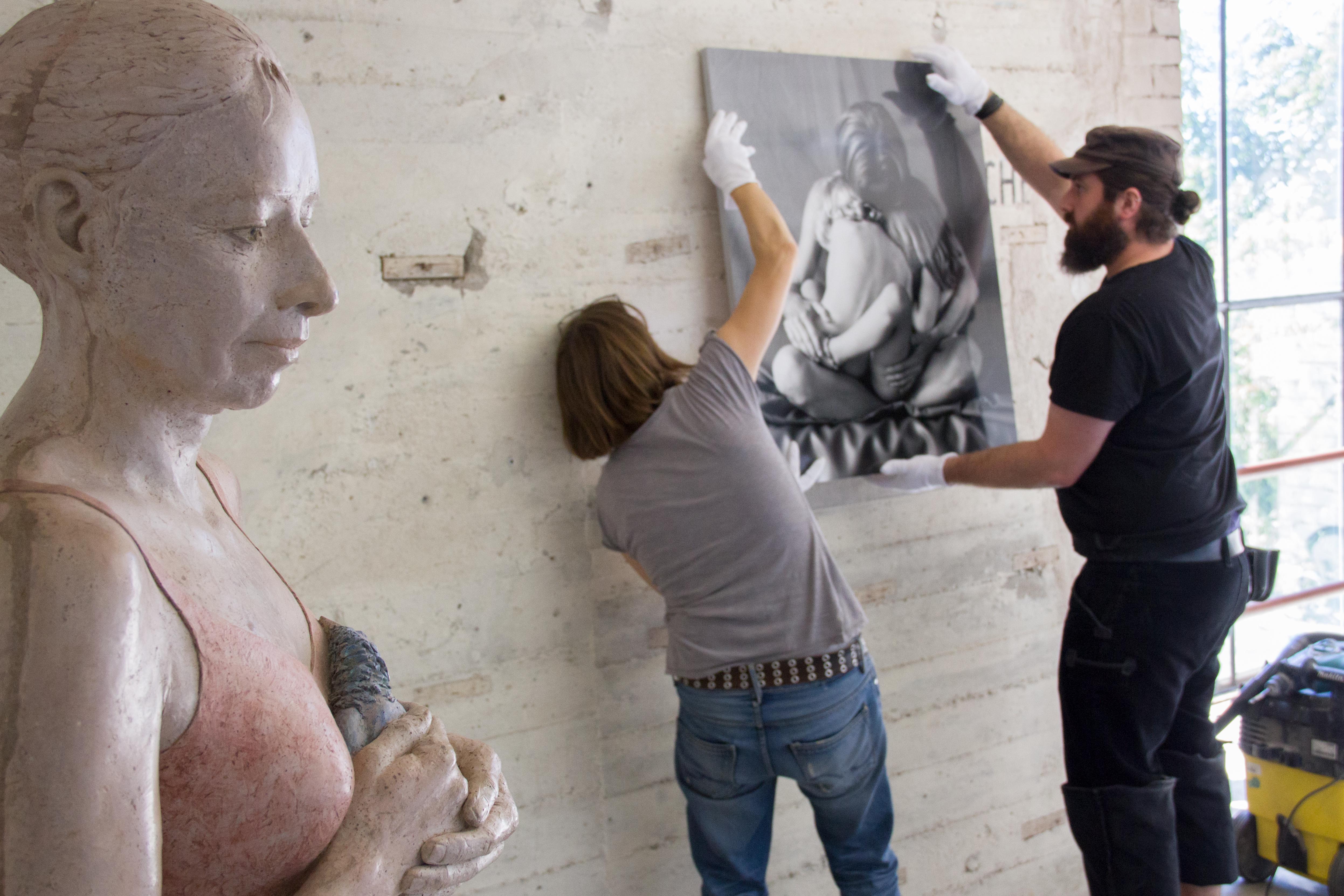Die Hängung erfolgt an den Wänden an Bewehrungseisen, die unter der Decke montiert sind. Für 50 Bilder sind S-Haken, Stahlseile und Bilderhaken (je zweifach) vorhanden.