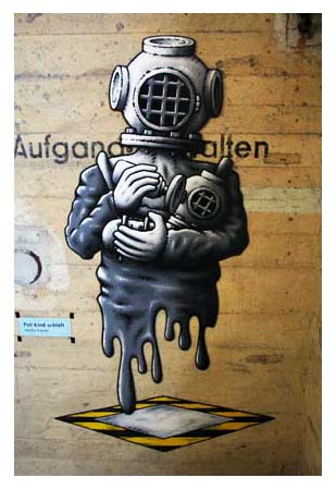 Der gebürtig aus Oldenburg stammende Sascha Kayser lebt seit 2006 in Kiel und ist als Maler, Illustrator und Objektkünstler tätig. Er arbeitet autodidaktisch und nähert sich seinen Werken stets mit Humor. Ebenfalls farblich am Bunker orientiert entwarf er so einige skurrile Illustrationen im Comicstil, die ebenfalls wie riesige Sticker an den Wänden prangten. Eine Figur mit nostalgischer Tauchermaske trug auf dem Arm ein Tauchermasken-Baby und fütterte es mit einer Sauerstoffflasche.
