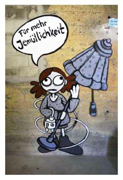Die gebürtige Berlinerin Katharina Kierzek studierte nach ihrer Ausbildung zur Baukeramikerin Freie Kunst an der Muthesius Kunsthochschule. Im Jahr 2008 eröffnete sie ihren „Atelierladen wirklich“ in Kiel. Ihre sonst so bunt gestalteten Comicfiguren passte Kierzek für diese Ausstellung an das Grau des Bunkers an. Wie übergroße Sticker zierten sie die Wände der Aufgänge; darunter ein grau gekleidetes Comic-Mädchen mit kugelrunden Augen, das mit einer riesigen Lampe im Arm „für mehr Jemütlichkeit“ warb.