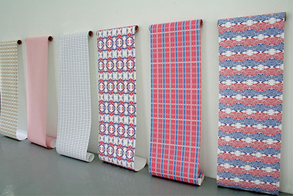 Auf 20 Tapetenentwurfsbahnen präsentiert Katja Flieger ihre Entwürfe zur Entstehung von Landschaften. Die Absolventin der Muthesius Kunsthochschule beschäftigt sich mit dem Künstlichen und dem Natürlichen, mit der Linie im grafischen Sinne. Aus Markierungen, Anweisungen, medizinischen Bauplänen und wissenschaftlichen Grafiken schafft sie ineinander fließende Landschaften in faszinierender Tapeten-Ornamentik. „Ich frage nach dem industriell Produzierbaren und beschäftige mich mit dem Vielfältigen und dem Einzigartigen. Entscheidet die Industrie oder der einzelne Mensch, was beigetragen wird?“