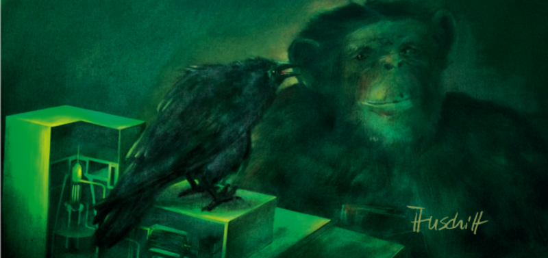 Auf einem seiner Bilder zwängt sich ein Elefant mit glitzerndem Kopfschmuck aus einem winzigen Zirkuswagon. Auf einem anderen blickt ein menschliches Skelett in das Schaufenster eines Kieler Pelzgeschäfts. Huschitt malt meist mit dunklen Farben. So auch die Gemälde der Affenserie „mehr licht“, die er als düstere Gleichnisse versteht. Hier zeigt er stets Primaten in symbolischen, oftmals unheimlichen Sinnzusammenhängen.