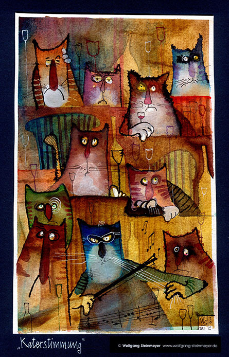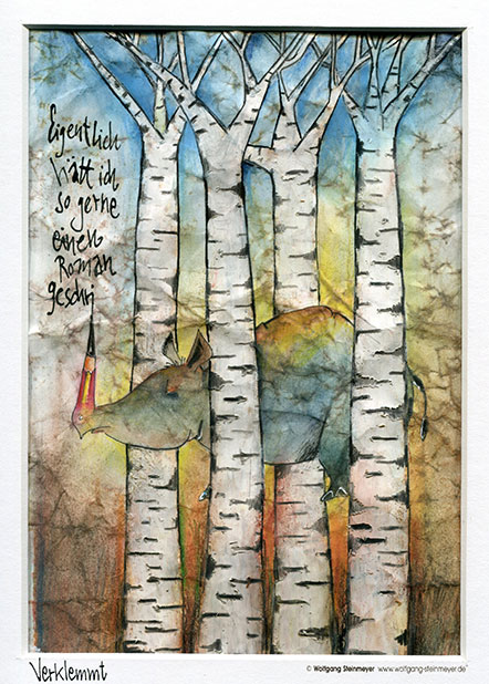 „Endlich sind meine Arbeiten mal sicher untergebracht!“ war Wolfgang Steinmeyers erster Gedanke zum Bunker-D als Ausstellungsort. Auch den Norden möchte er gerne kennenlernen. „Mich reizen die Atmosphäre, das Neue und überhaupt die für mich fremde Stimmung an der Ostsee“, so der im Allgäu lebende Künstler. Die meisten seiner Zeichnungen sind in Mischtechnik angelegt: Die Arbeit „Verklemmt“ beispielsweise besteht aus Ölkreide, Tusche, Aquarell und zerknittertem Papier; bei „Katerstimmung“ handelt es sich um eine Schichtaquarellzeichnung mit Tusche.