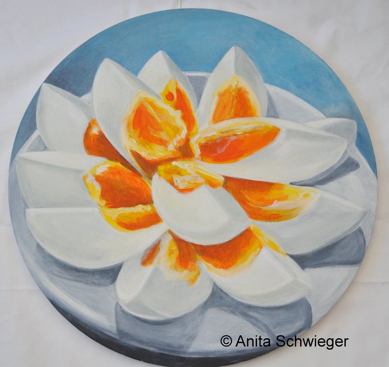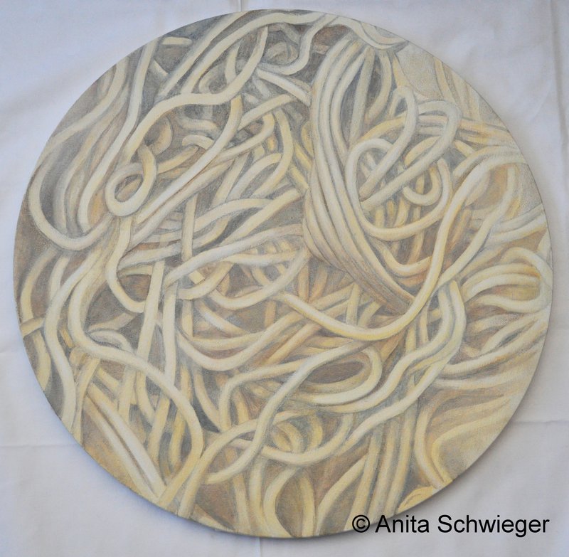 Warum Nahrung der Dreh- und Angelpunkt ihrer künstlerischen Arbeit ist? Wie auch andere Kunstschaffende beschäftigt sich Anita Schwieger mit der Suche nach Realität, die für sie eindeutig im Essalltag zu finden ist. „Essen stellt für mich ein brisantes Thema dar, das starken Veränderungen unterliegt“, erklärt sie. „Meine Kunstwerke aus einer großen Zahl von unterschiedlichen Lebensmitteln sind Ausdrucksmittel und Metapher für meine Überlegungen.“ Nahrungsgewohnheiten seien „Schwerpunkte“ im Leben und – im Hinblick auf die Zukunft der Weltgesellschaft – längst keine private Angelegenheit mehr. Bei ihrer optisch genießbaren Kunst stehen nicht der kleine Hunger zwischendurch oder der tägliche Verzehr zur Debatte, sondern „es geht um die Selbstverständlichkeit, mit der wir mit Essen umgehen, um Überfluss, Verteilung und Botschaften an uns selbst.“