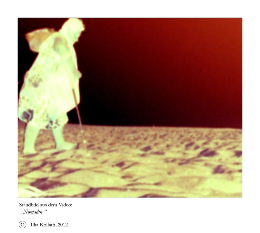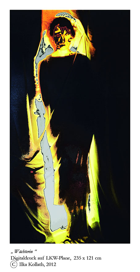 Neben einem weiteren Digitaldruck auf LKW-Plane präsentiert Ilka Kollath auch drei Videoarbeiten. „Wie bereits der Titel „was bleibt“ vermuten lässt, sind es Fragen existentieller Art, die ich mit meinen Arbeiten in dieser Ausstellung stelle“, so die Künstlerin. In ihrem Video „was bleibt“ untersucht sie, was bleibt, wenn die Welt ins Wanken gerät, der Boden unter den Füßen verschwindet und nichts mehr fest ist. „Ein Mensch springt ins Wasser, die Zeit beginnt abzulaufen, der Boden schwankt und das Auge des Betrachtenden versucht, in einem Fixpunkt Halt zu finden“, erklärt sie. In „Nomadin“ geht es um das Fortgehen und die Frage, was bleibt, wenn nichts mehr von Dauer und Beständigkeit ist. Von pathetischer Musik und ihrem Schatten angekündigt, durchschreitet eine alte Frau würdevoll und einsam das Blickfeld der Kamera. „Der Bunker als Sinnbild von Bedrohung, Angst und Tod, welche immer noch schwer auf den morbiden Gemäuern lasten, hat mich in besonderem Maße inspiriert, Arbeiten zu dieser Thematik auszustellen“, sagt Ilka Kollath.