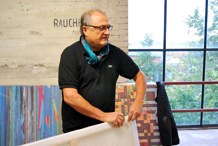 Dieses Thema beschäftigt den Künstler schon seit langer Zeit. Wie können viele Informationen auf kleinstem Raum gebündelt werden? Was bewirkt eine Kompression? Welche Informationen gehen dabei verloren? Diesen und vielen weiteren Fragen ging er in zahlreichen Labortests nach und präsentierte seine Ergebnisse in einer speziellen Installation seiner Bilder im Bunker-D. Ein Raum beherbergte die Serie „Compressed-World“. Was wie unzählige, bunte horizontale Linien wirkt, sind Aufnahmen von meist exotischen Orten der Welt, die auf zehn Zentimeter Höhe und 100 Zentimeter Länge komprimiert wurden. In diesem Raum waren auch die Ströme der digitalen Welt in Form von QR-Codes eingefügt, die Michael Weisser sehr faszinieren: bunte, durch Farbe und Auflösung maximal entfremdete und doch funktionsfähige Würfelsammlungen. Die QR-Codes leiten in eine Welt der intermedialen Erlebnisse und halten viele Überraschungen bereit, wie Videos, Musik, Klänge oder Poesie. Auf die digitale Welt konzentriert sich auch die Serie „i:Codes“ im zweiten Ausstellungsraum. Riesige, vielfarbige gemalte QR-Codes fallen sofort ins Auge, hier ist jedoch eine andere Form der Verdichtung zu sehen: Das Video „Poems-In-Motion“ zeigt 30 gleichermaßen gestaltete „i:Codes“, die zu unterschiedlichen rezitierten Gedichten sowie vier Büchern des Künstlers weiterführen.