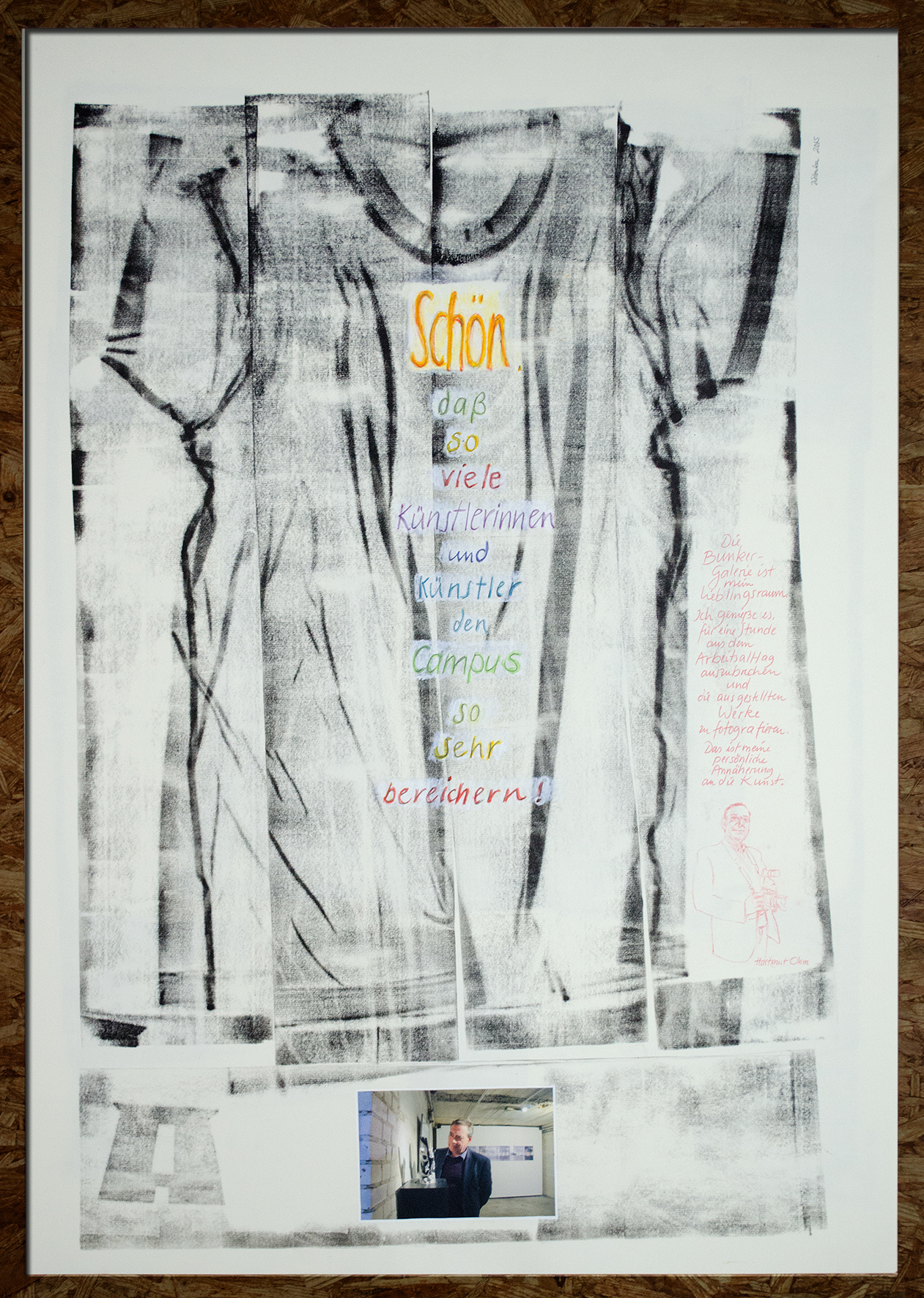Anhand von Grafiken, die sie mit Fotos und persönlichen Statements des Bunkerteams versieht, gibt Ann-Carolin Zielonka „denjenigen Bild und Stimme, die damals an Umbau und Umwidmung des geschichtsbelasteten Gebäudes beteiligt waren, Hand angelegt und Ideen eingebracht haben, und jetzt noch den Betrieb aufrechterhalten,“ und bietet die Gelegenheit, „sie mit Lob zu überschütten“. Auch den Bunker selbst würdigt die Künstlerin, wie sie sagt, „installativ“.