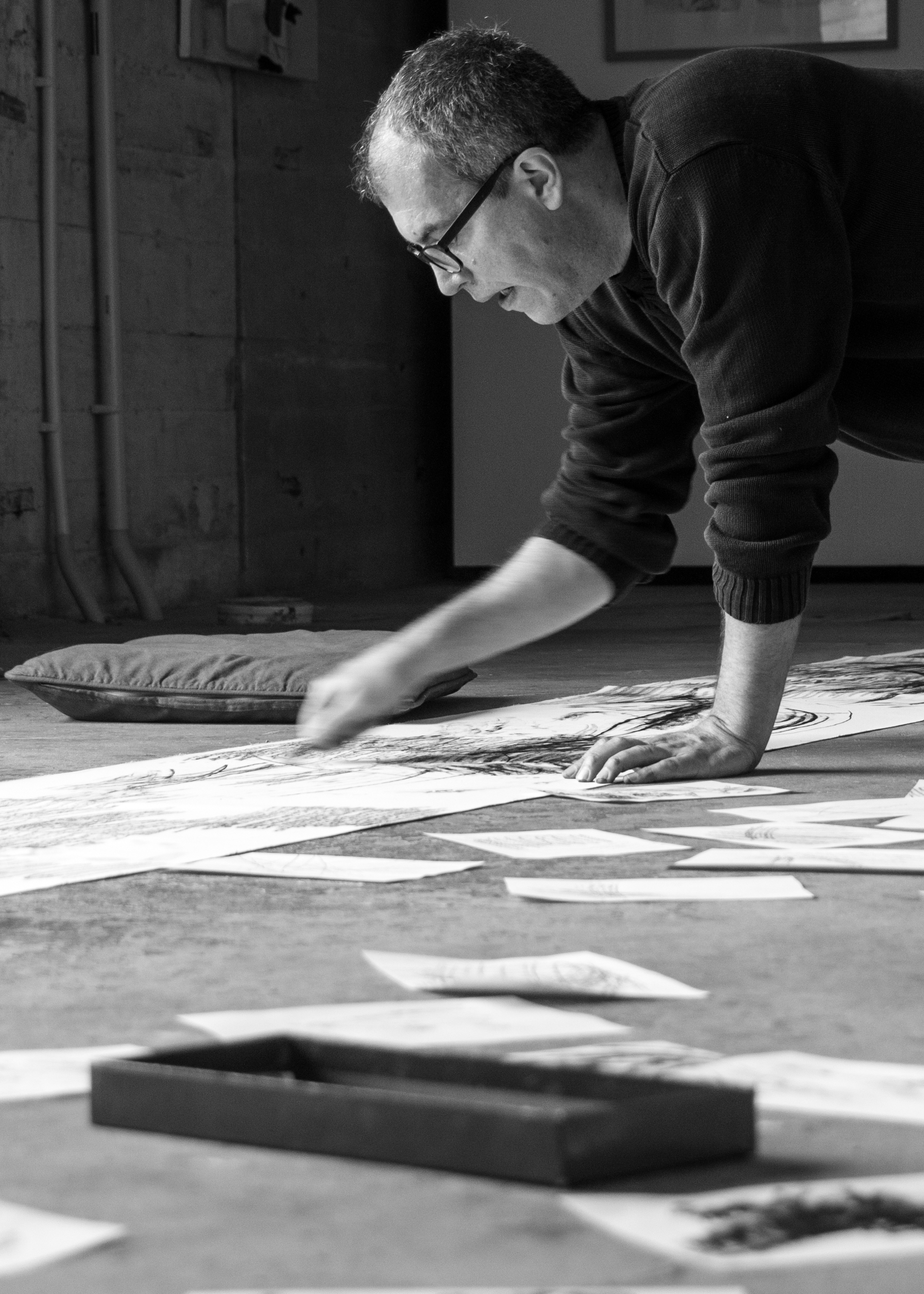Im ersten Schritt eignet sich Jens Lay den späteren Ausstellungsort mithilfe von Techniken wie Handzeichnung, Frottage und Fotografie – teilweise kombiniert mit verschiedenen Druckverfahren – an. „Anschließend interpretiere ich die Strukturen des Raumes sowie gefundene Spuren und verknüpfe sie mit physisch vorhandenen Elementen“, erklärt er sein künstlerisches Vorgehen. Dabei handele es sich nicht um eine systematische Spurensicherung, sondern um eine subjektive Auswahl, die gestalterischen Ideen folge. „Für mich steht das Spiel mit den Möglichkeiten der Hand und digitaler Techniken zunächst im Vordergrund – nie zufällig und doch nicht im Voraus geplant. Durch Überarbeitungen im Atelier und am Computer lasse ich die Werke später organisch wachsen.“