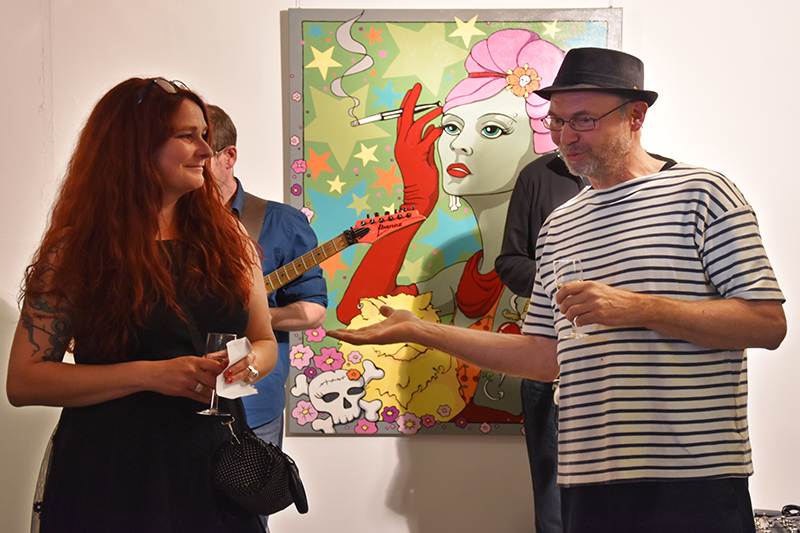 Silja Gothe im Gespräch mit Vernissage Besuchern.