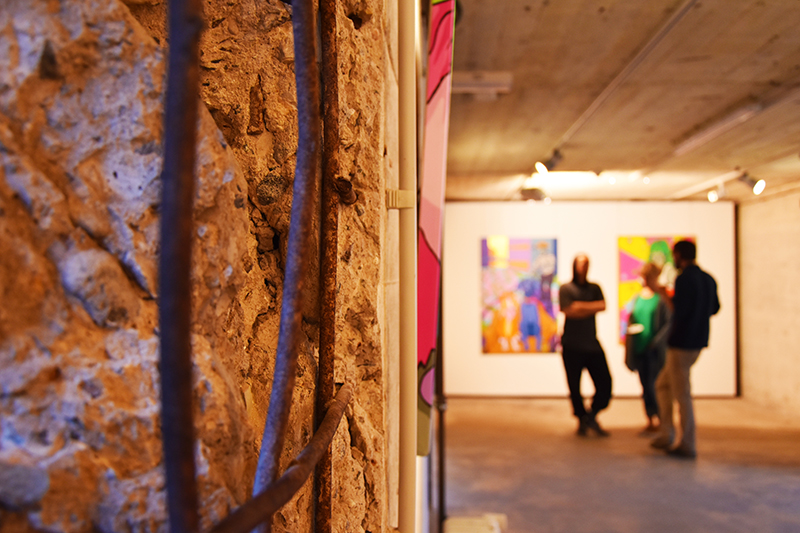 Bunte Farben auf grauen Bunker Wänden leuchten in der Galerie Bunker-D.