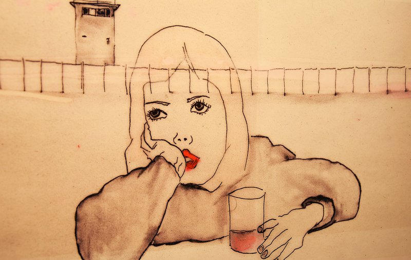 Die Arbeiten sind überwiegend in grau gehalten, die Künstlerin setzt jedoch mit Neonfarben leuchtende Akzente.