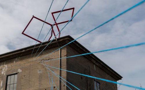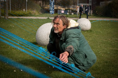 Künstler Mathias Wolf beim Aufbau der Konstruktion