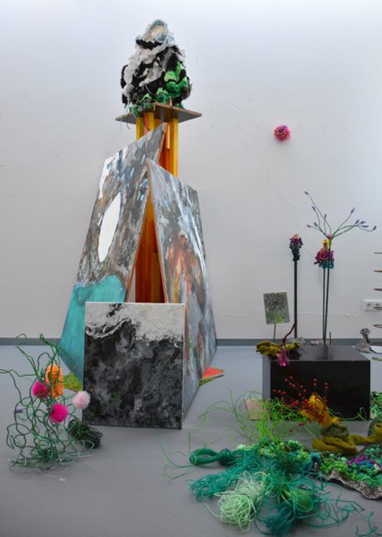 Stefanie Wochs Objekte muten auf den ersten Blick floral an, sind aber tatsächlich hochartifiziell. Um die Bilder herum und aus den Bildern heraus rankt und wuchert es, über Wände und Boden in den Raum hinein. Die Objekte bestehen aus Wolle und Wäscheleine, Biegedraht, Beton, Kabelbindern, Staubwedeln und Konfetti. So ragen am Fuße eines gehäkelten Gletschers püschelige Gewächse empor, eine Ansammlung Blumesken gibt sich landschaftlich. Und, igitt, da kriecht eine Nacktschnecke!