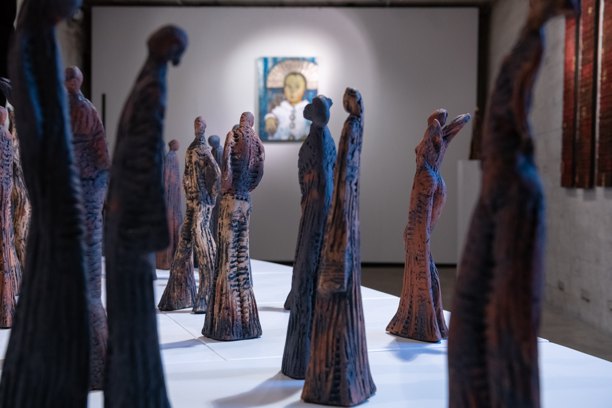 Einen Spannungsbogen erreicht die Künstlerin durch die Gruppierungen der Figurinen, deren Zusammengehörigkeit durch die Verwendung unterschiedlich farbiger Tonerden provoziert wird und ein Nachdenken über deren Fragestellungen anstößt: