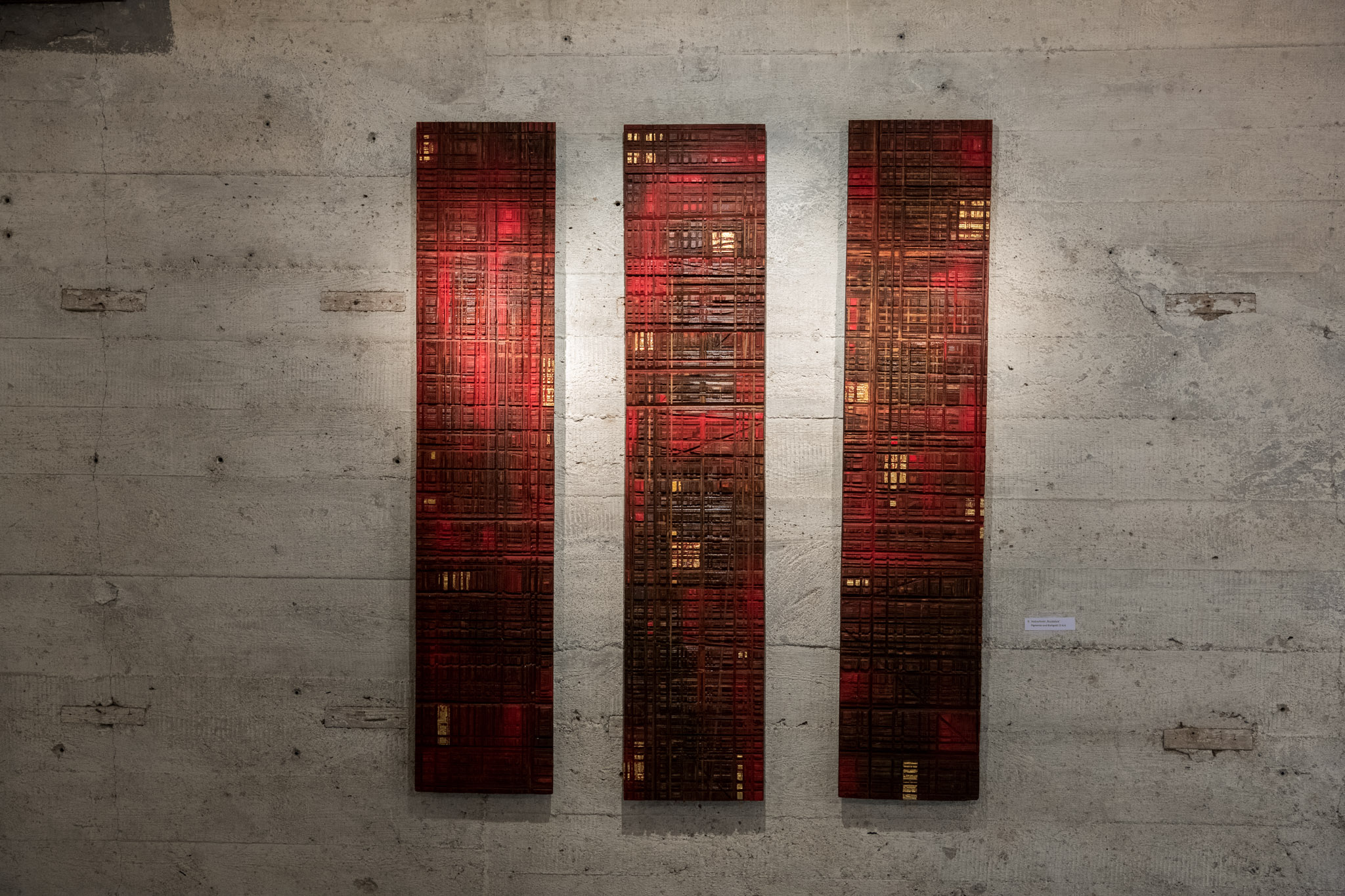 Wenn auch Fragen unbeantwortet bleiben, ist etwas ganz eindeutig: Die Statuetten nehmen durch die vergleichbare reliefhaft zerklüftete Oberflächenstruktur direkten Kontakt zu den als Triptychon und Diptychon komponierten Holzschnitten auf. Die waagrechten, senkrechten und diagonalen Kerben stammen von schweren metallischen Trennschreiben, die bei der Steinbearbeitung verwendet werden. Die Platten dienten der Künstlerin ursprünglich als Unterlage für den künstlerischen Bearbeitungsprozess ihrer Steinskulpturen. Dementsprechend waren die Platten vor der Erhebung zum Wandobjekt ein Abfallprodukt. Karin Weißenbacher erkannte jedoch die Möglichkeiten der zerschundenen Platten, sie zu neuem Leben erwecken zu können. Mit ihnen setzte sie ein Zeichen für Verletzung und gleichzeitig ein solches für mögliche Heilung und Verwandlung.