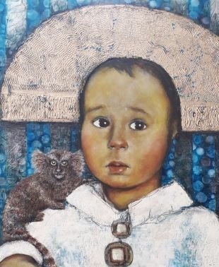 Hoheitlich, wie die von Diego Velázquez gemalte Infantin des spanischen Königshauses, treten uns auch die drei Kinderporträts von Karin Weißenbacher entgegen: Berik mit Tamarin, Hanno mit Rotkehlchen und Jonte mit Eule.