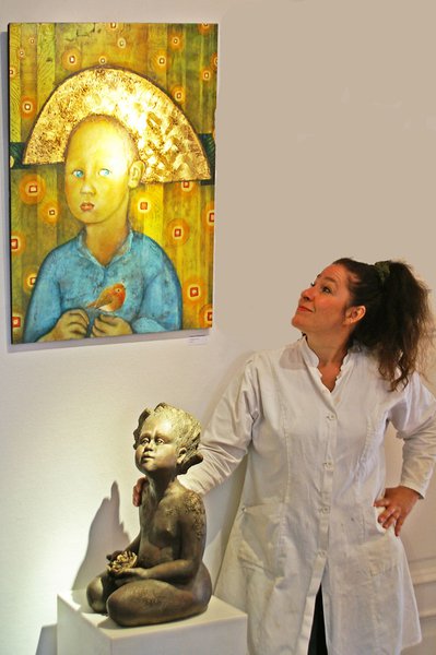 Es ist eine facettenreiche Schau völlig unterschiedlicher Arbeiten aus den vergangenen sieben Jahren Malerei und Bildhauerei. Ich zeige in Bild und Objekt meine jüngsten Arbeiten: die ‚Reisenden im Dialog‘, 30 Figurinen von etwa 40 cm Höhe aus gebranntem und glasiertem Ton. In Resonanz dazu werden die ‚Holzschnitte‘ aus meinem ‚Art Projekt Holzschnitt‘ 2018 zu sehen sein. Es sind jetzt Wandobjekte, die ursprünglich aus den Arbeitsprozessen der Steinbearbeitung stammen. Im Kontrast dazu zeige ich meine jüngsten Bilder: barock in Szene gesetzte Kinderportraits in surrealen Farblandschaften in Öl-Lasur auf Holz gemalt. Im Bunker-D werden außerdem weitere Bilder in Öl-Lasur und Mischtechnik auf unterschiedlichen Holzarten sowie figürliche Arbeiten und Objekte aus Bronze und gebranntem Ton zu sehen sein.