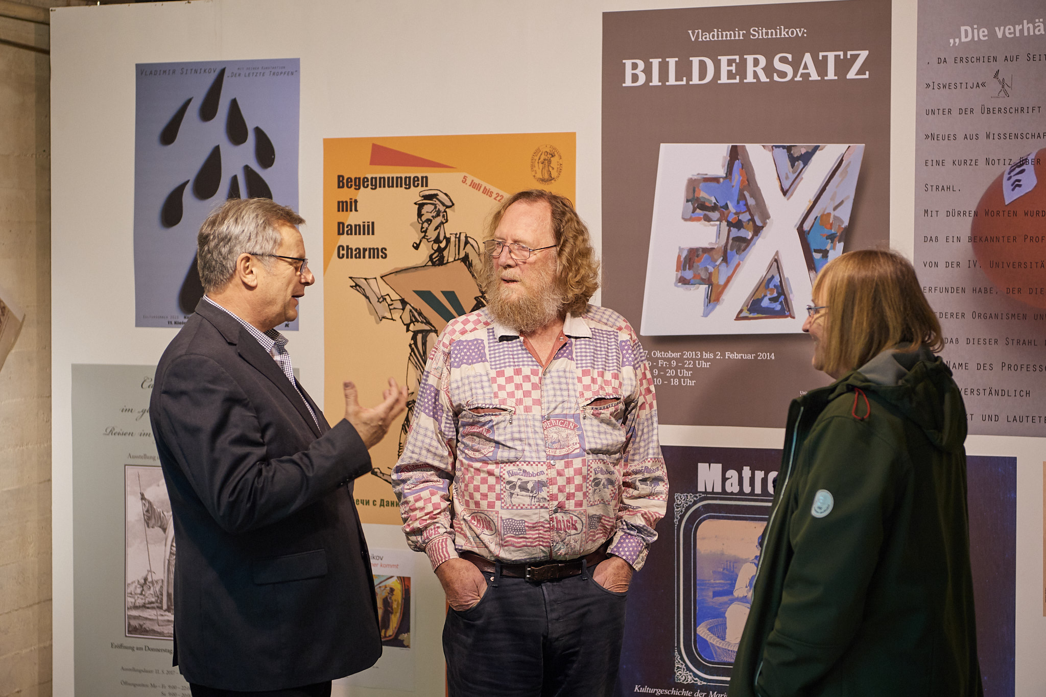 Vladimir Sitnikov war gerne bereit, den Gästen ihre Fragen zu beantworten. Hier sieht man ihn vor Plakaten vergangener Ausstellungen, die er selbst gestaltete.