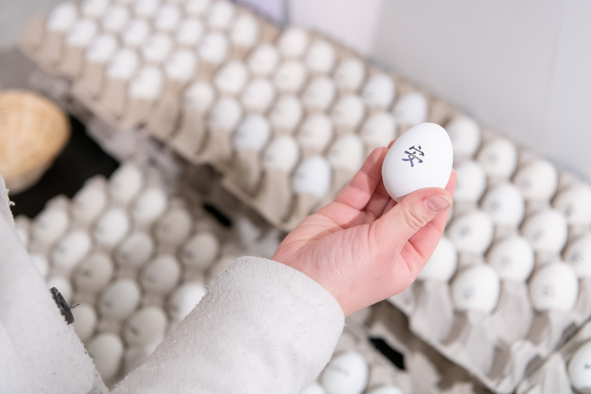 Chinesisch, hebräisch, indisch ... - Die Künstlerin hat für ihren Eierstand circa 1000 industriell gefertigte Eier mit dem Wort Frieden in 17 Sprachen gestempelt.