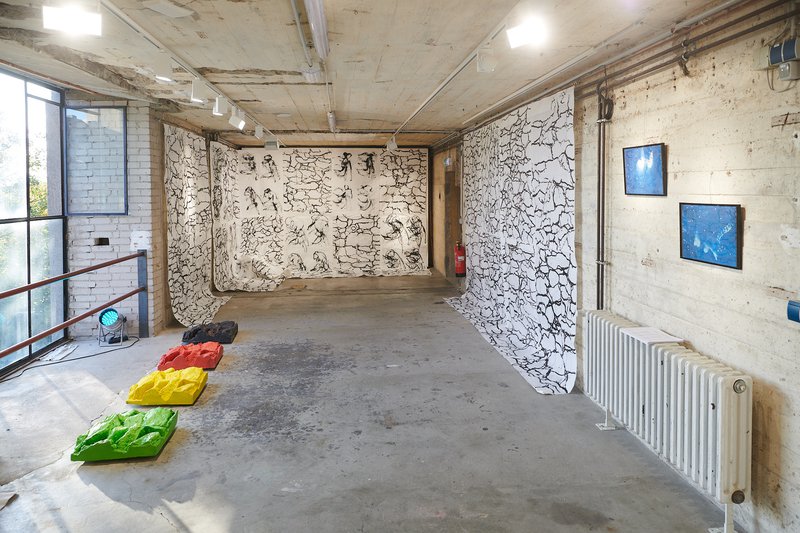 Der Ausstellungsraum im Bunker-D mit Malereien.