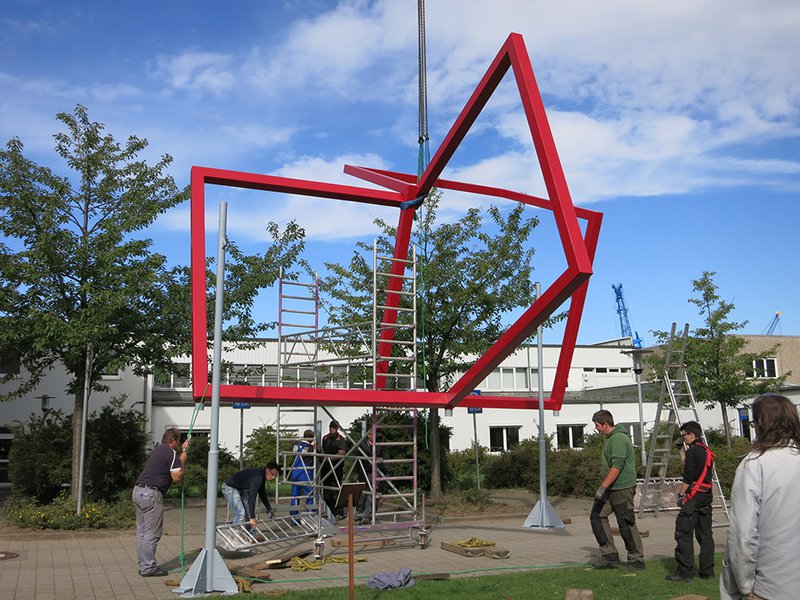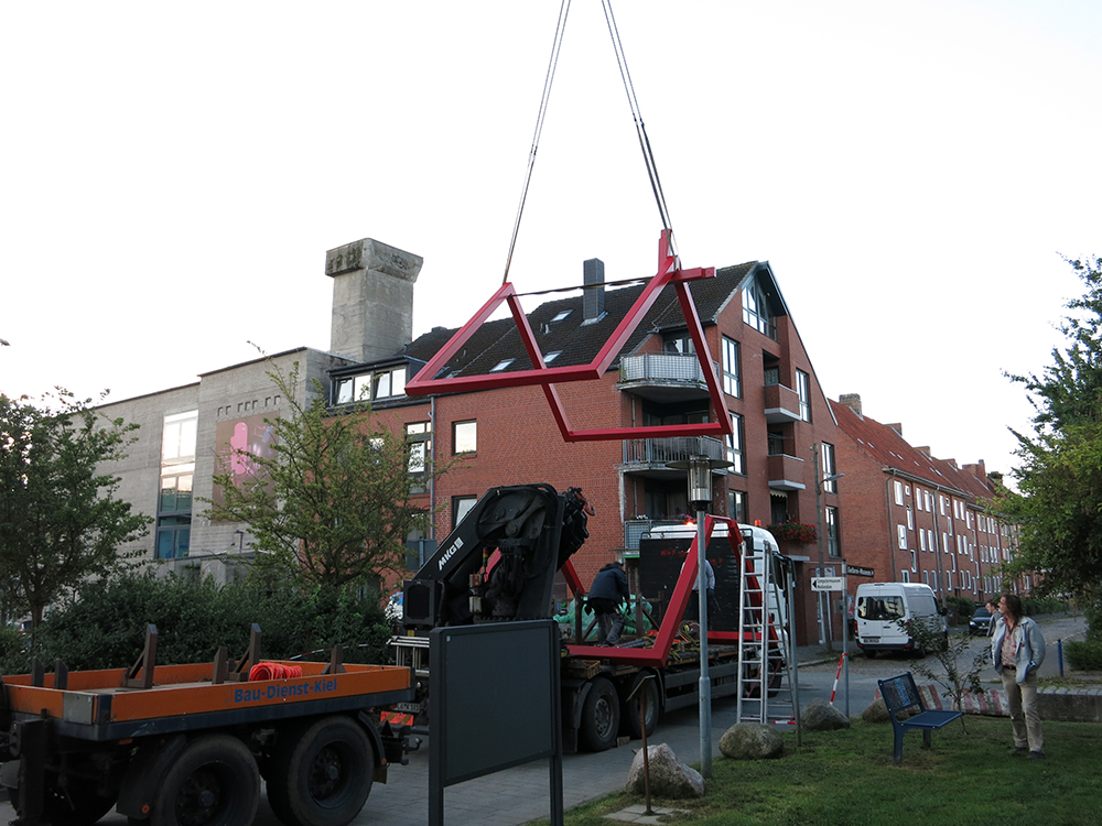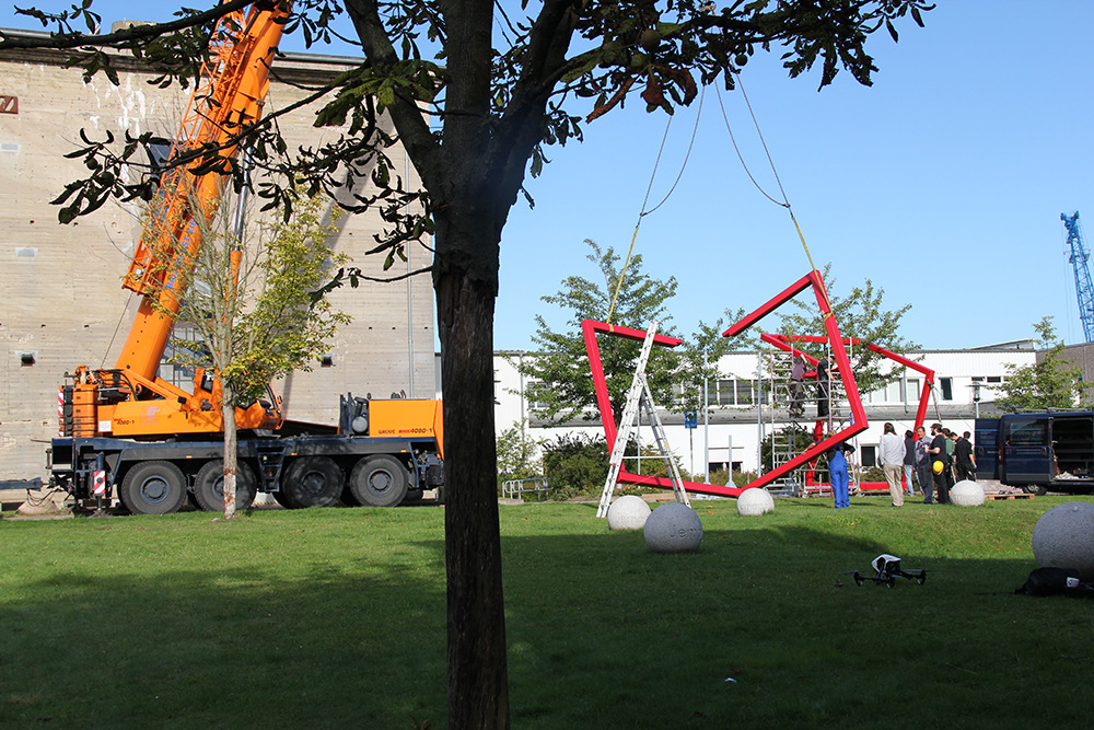 Sie wurde in zwei noch getrennten Elementen angeliefert und bevor sie auf das Bunkerdach gehoben werden konnte, mussten die beiden Werkteile auf dem Max-Reichpietsch-Platz zusammengeschraubt und die Standfüße montiert werden.