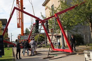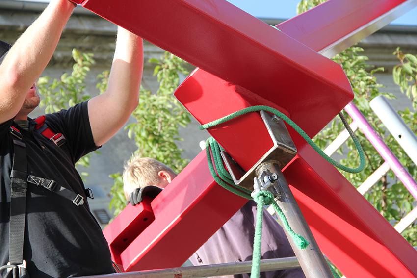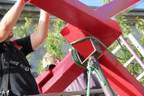 Nach dem Verbinden der beiden Einzelelemente der "KUBUS BALANCE" ging es schließlich an die Montage der vier blau-grau lackierten Standfüße, deren mittlere zwei Meter, die beiden äußeren Standfüße vier Meter hoch sind.
