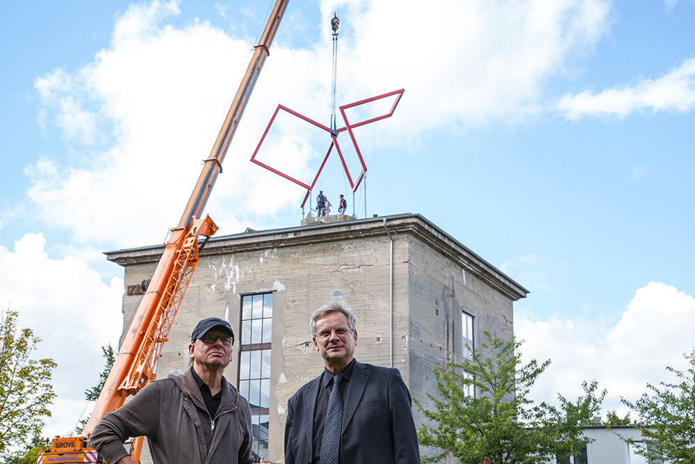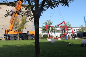 Der Kontaktpunkt der beiden zu verhakenden Elemente war die ehemalige Schwachstelle der roten Stahlskulptur, doch für die Montage auf dem Dach des Bunker-D mussten Stabilität und Sicherheit besonders gewährleistet werden. Durch eine Neuberechnung der Statik und eine spezielle Konstruktion konnte die "KUBUS BALANCE" nun perfekt ausbalanciert und somit stabilisiert werden.