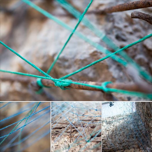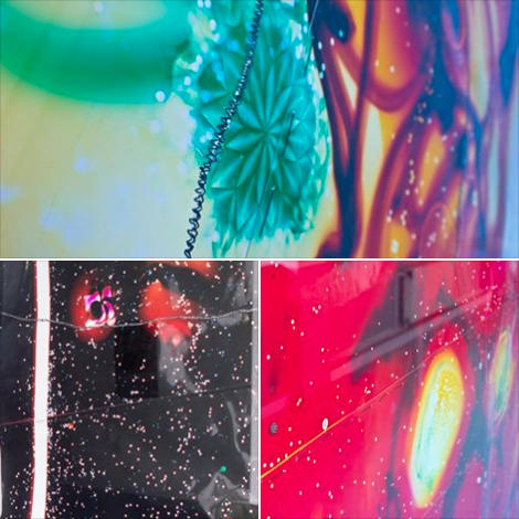 und das ist verknotet. Grün mischt sich mit Blau in endlos wirkenden Linien und verknotet und verzweigt sich mehr und mehr. Hat es ein Eigenleben? Es überzieht die Wände und klettert daran hoch, hält sich an jedem Vorsprung und jeder Eisenstange fest. Doch wo will es hin? Wächst es vielleicht dem lichten Ausgang im Dach entgegen? Oder nahm es seinen Ursprung dort oben und kriecht nun an den Wänden hinunter?