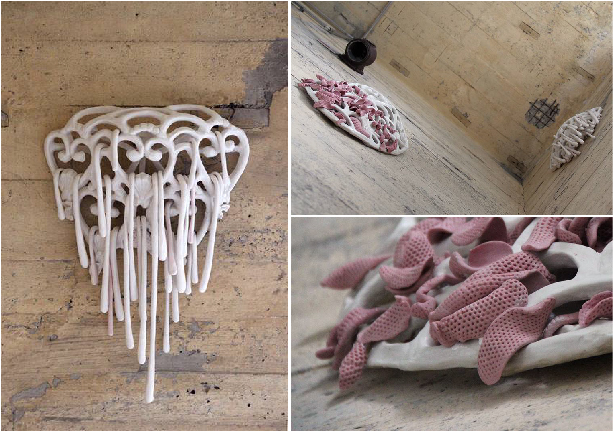 Ich sehe was im Bunker, was Du nicht siehst – und das ist schnörkelig. Etwas Rosafarbenes kreucht und fleucht dort. Es windet sich durch die herzförmigen Öffnungen und sucht einen Weg nach draußen. Es läuft aus und tropft weiß und zähflüssig aus mehreren Metern Höhe. Doch finden die wimmelnden Tonstücke ihren Weg hinaus und werden die Porzellantropfen auf dem Boden aufschlagen? Schaut doch einmal selbst nach.
