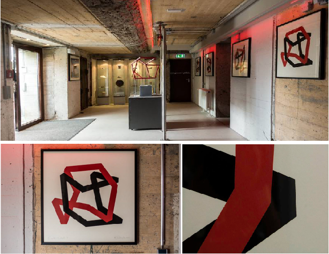 Ich sehe was im Bunker, was Du nicht siehst - und das ist eckig überall und dreifarbig. Auf weißem Grund rot und schwarz verschlungen, ineinander verrungen. Wie Ringe? Eheringe? Gedruckte Würfel im großen Würfel aus Beton. Und ein großer aus drei Tonnen Stahl ruht auf dem Dach.