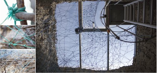 Grün mischt sich mit Blau in endlos wirkenden Linien und verknotet und verzweigt sich mehr und mehr. Hat es ein Eigenleben? Es überzieht die Wände und klettert daran hoch, hält sich an jedem Vorsprung und jeder Eisenstange fest. Doch wo will es hin? Wächst es vielleicht dem lichten Ausgang im Dach entgegen? Oder nahm es seinen Ursprung dort oben und kriecht nun an den Wände hinunter?