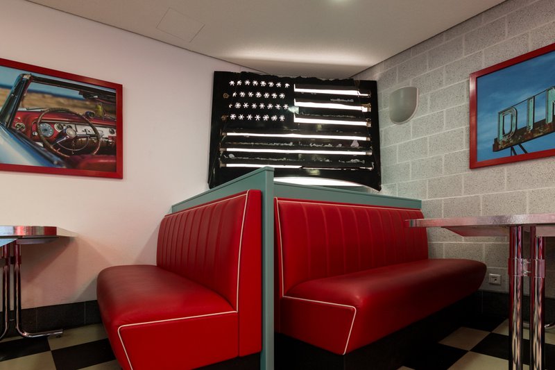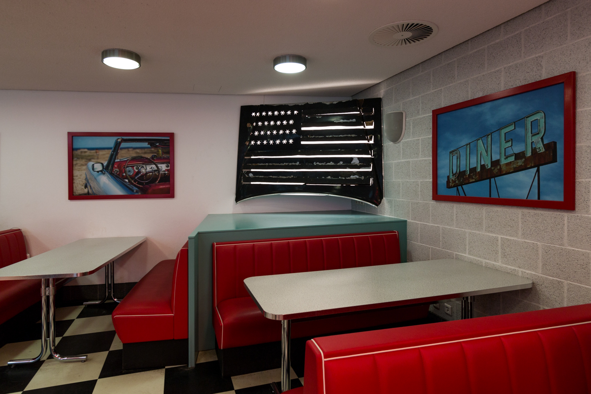 Die "Amerikanische Nationaflagge" hängt seit 2018 im American Diner der HAW Kiel. In der dieser Ecke der Kantine ist das Werk des Künstlers Siebenrock nicht zu übersehen.