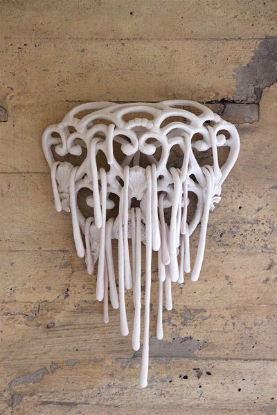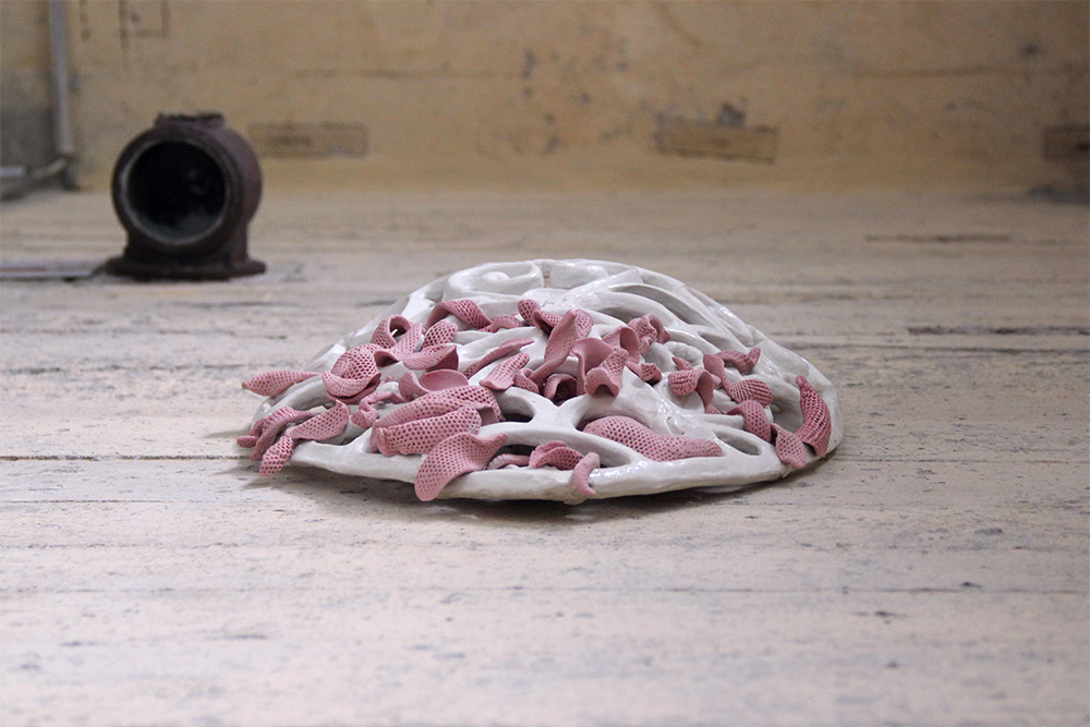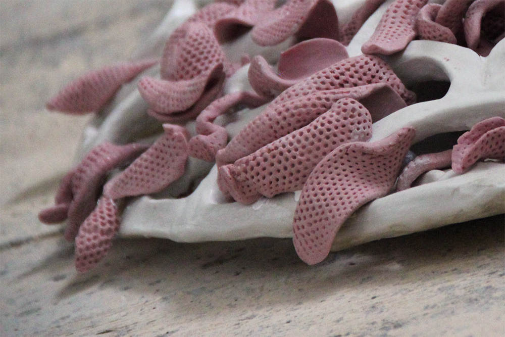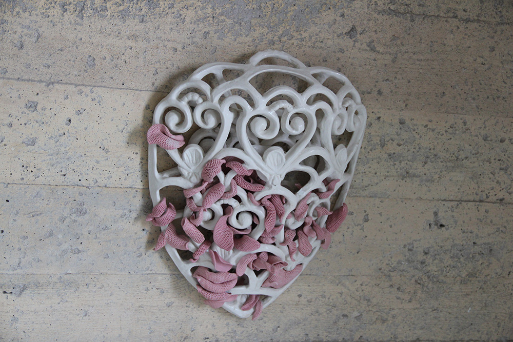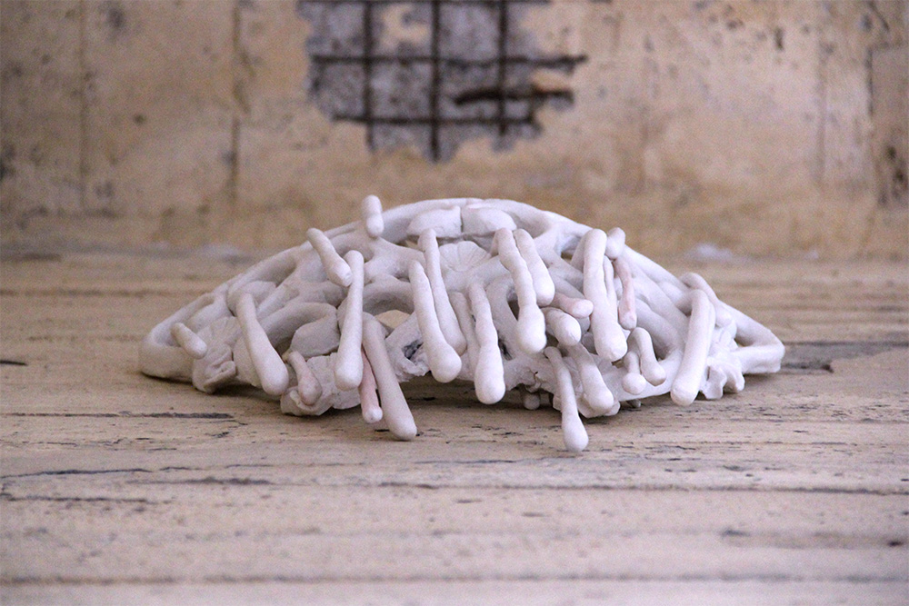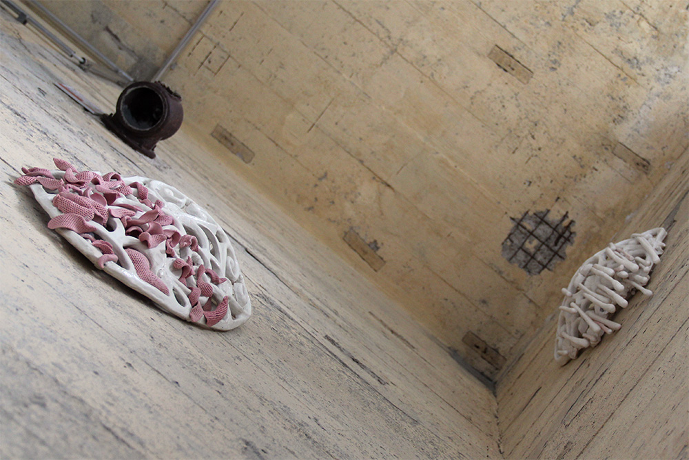Imke Freiberg studierte an der Hochschule für Kunst und Design Halle am Fachbereich Keramik, daher liegt ihr künstlerischer Schwerpunkt meist auf der Fertigung keramischer Installationen und Plastiken. Diese beiden aus der Serie „Trutz und Heim“ stammenden Werke präsentierte sie 2013 in ihrer Ausstellung „[cache]“ im Bunker-D.