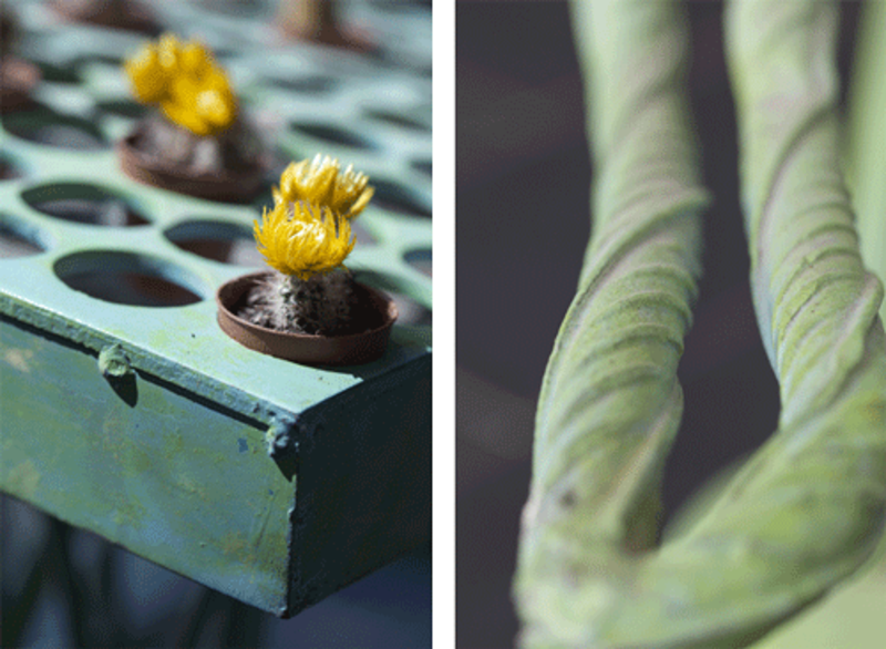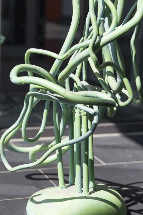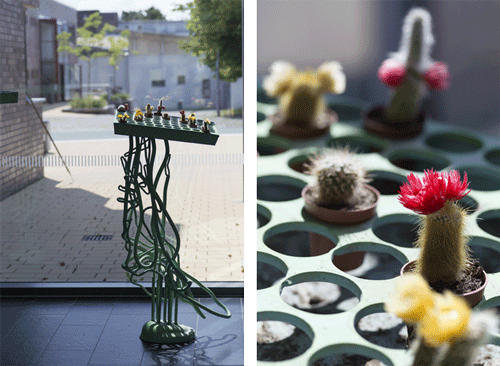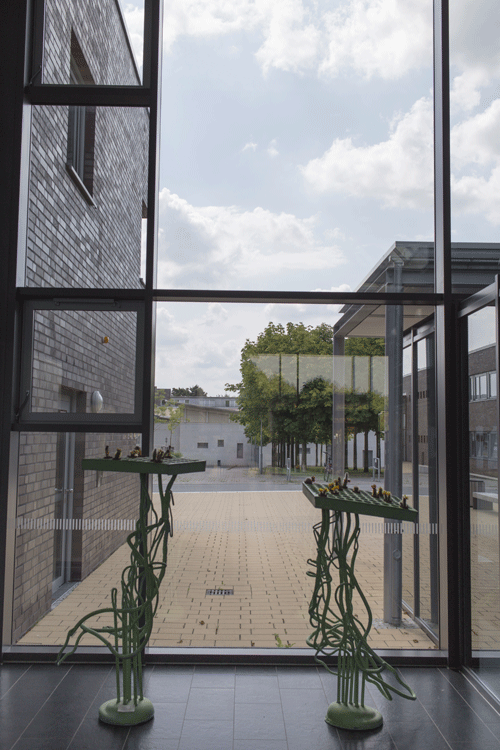 Die beiden Stahlskulpturen „An Stadt – Statt Grün“ von Insa Winkler bestehen aus verzinktem und grün bemaltem Stahl. Mit ihren 160 x 70 und 145 x 65 Zentimetern Größe füllen sie seit 2009 den Platz hinter der Glasfassade des Mehrzweckgebäudes gut aus und bilden mit ihrem Grün und den bunten Kakteen einen schönen Kontrast zum schwarzen Fliesenboden.