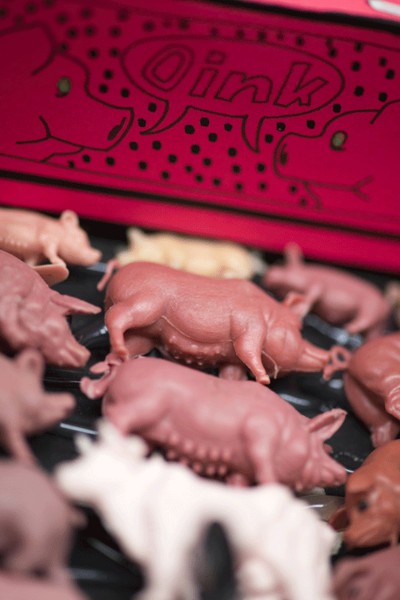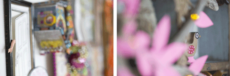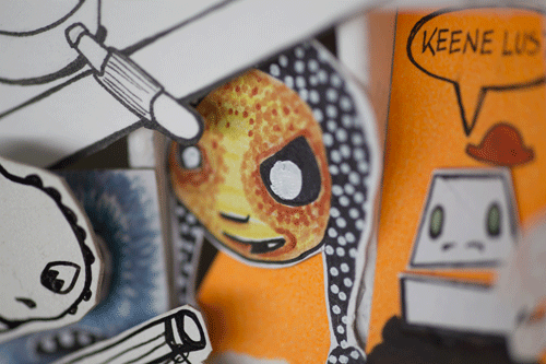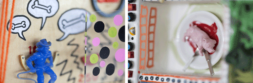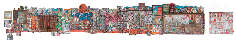 Katharina Kierzek fertigte das acht Meter lange Kunstwerk „Das lange Elend" als Auftragsarbeit für die HAW Kiel an. Rechts daneben befindet sich die Jahresgabe für den Schleswig-Holsteinischen Kunstverein, die aus zwei Setzkästen besteht und die Themen Raum und Zeichnung auf kleinem Maßstab verknüpft. Nun ist sie fester Bestandteil des „langen Elends", das sich vielfältige Details und collagierte Zeichnungen besticht.