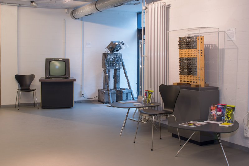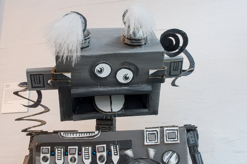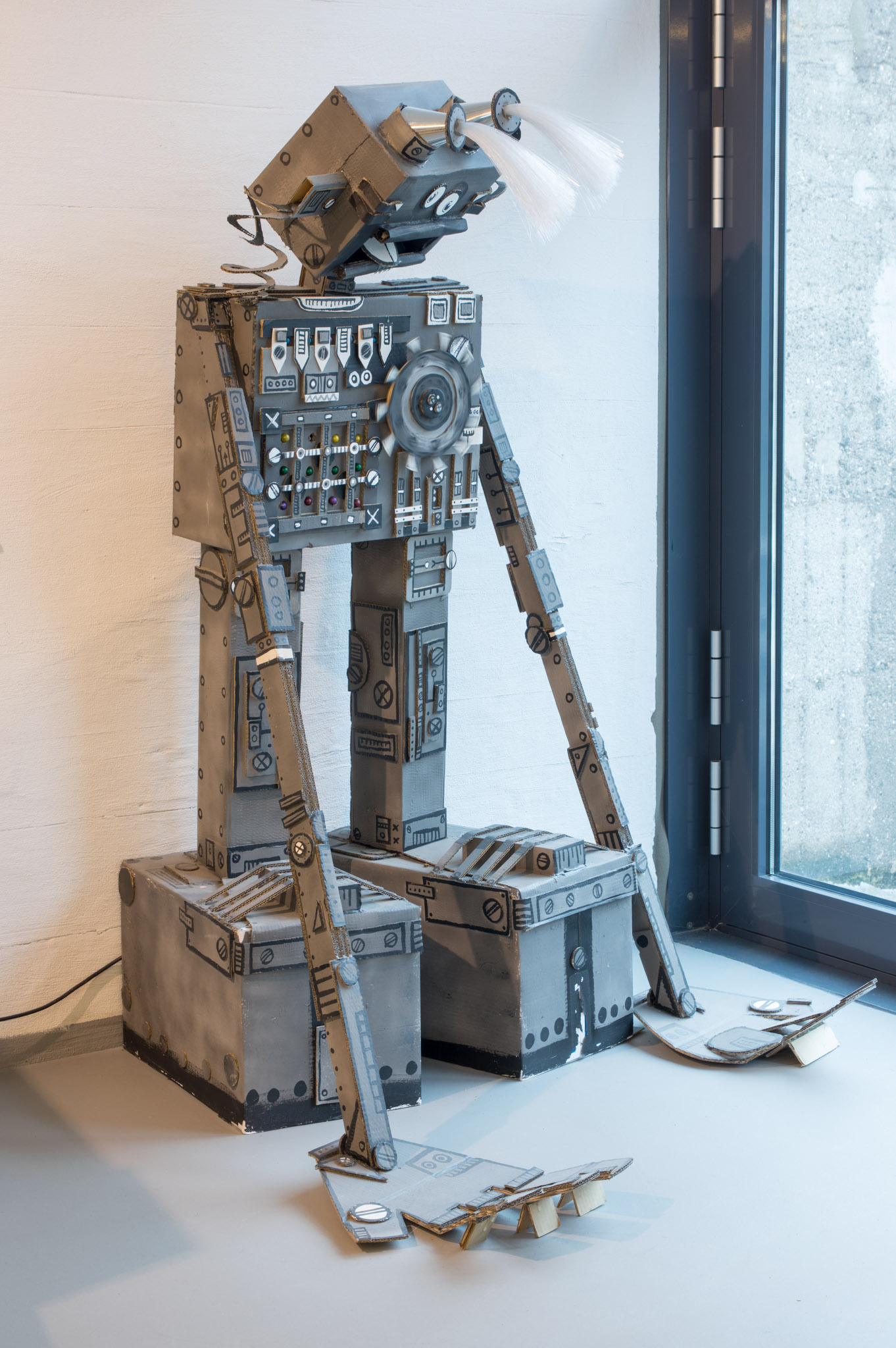 Der Körper des menschengroßen Roboters der Wahlkielerin Künstlerin Katharina Kierzek besteht hauptsächlich aus Pappe und Karton. In diese Körperteile sind ihm bunte, blinkende Lichter eingebaut, seine Oberfläche ist mit aufgmalten oder geklebten Knöpfen gestaltet und auch auf seiner Rückseite gibt es viele kleine Details zu entdecken.