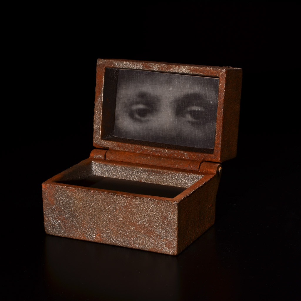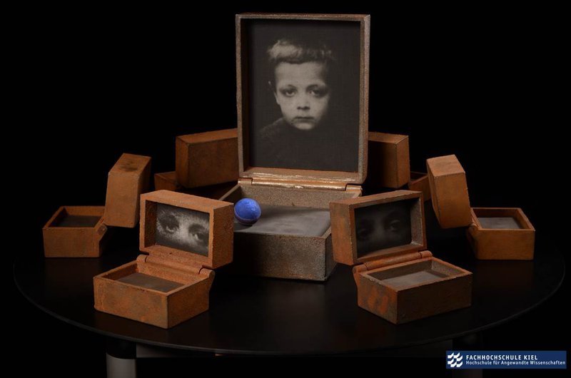 Die sieben massiven Eisenboxen der russischen Künstlerin Lena Liv stammen aus dem Fundus des ehemaligen Landeskulturzentrums Salzau, das 2011 aufgelöst wurde. Die größte misst 34 x 20 x 28, die kleinen umfassen jeweils 12 x 8 x 9 Zentimeter. Jede der Boxen ist ein Unikat. Die Papierblätter im Inneren sind handgemacht.