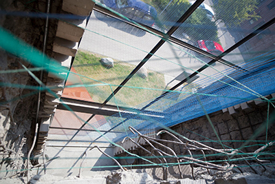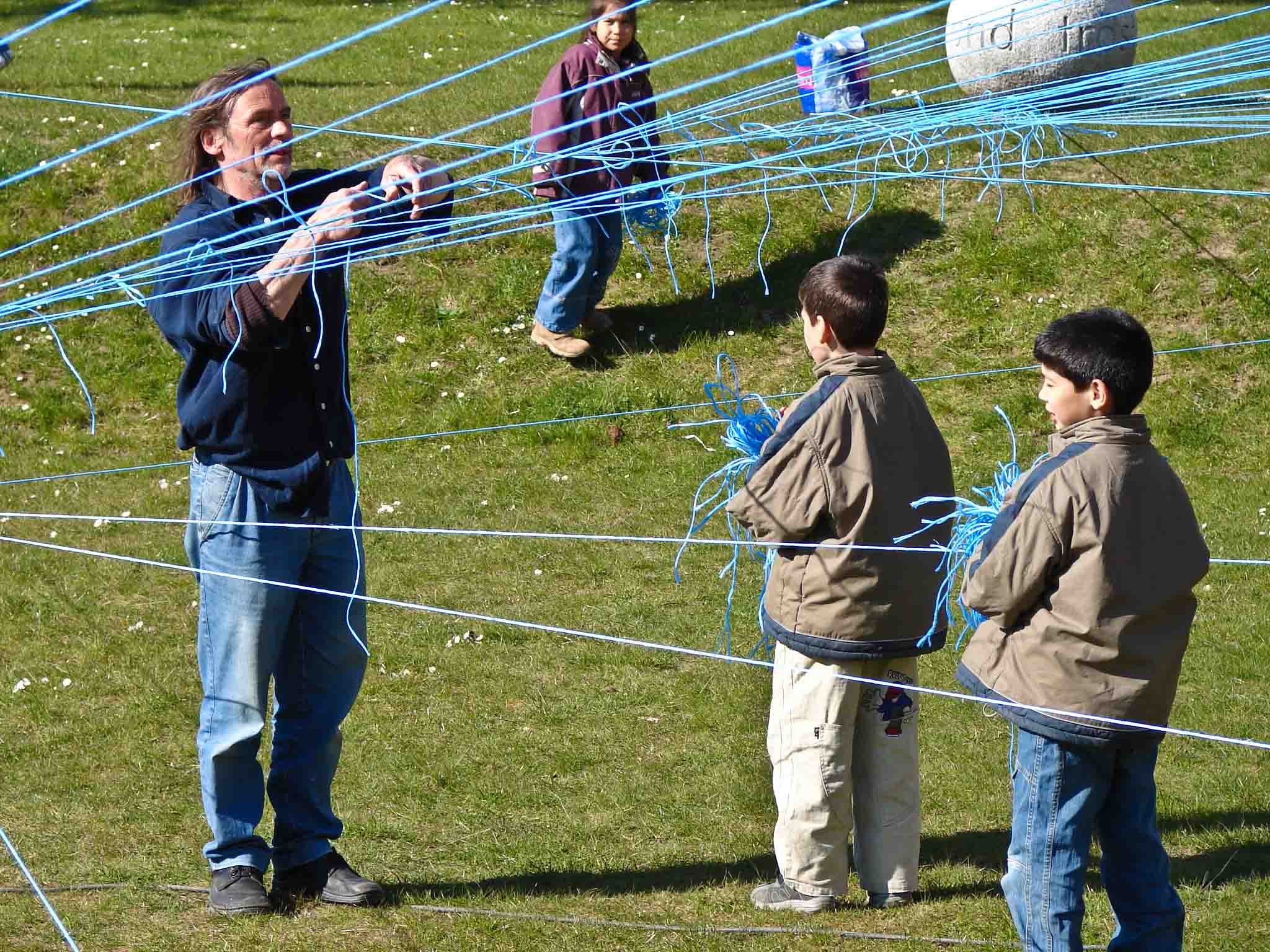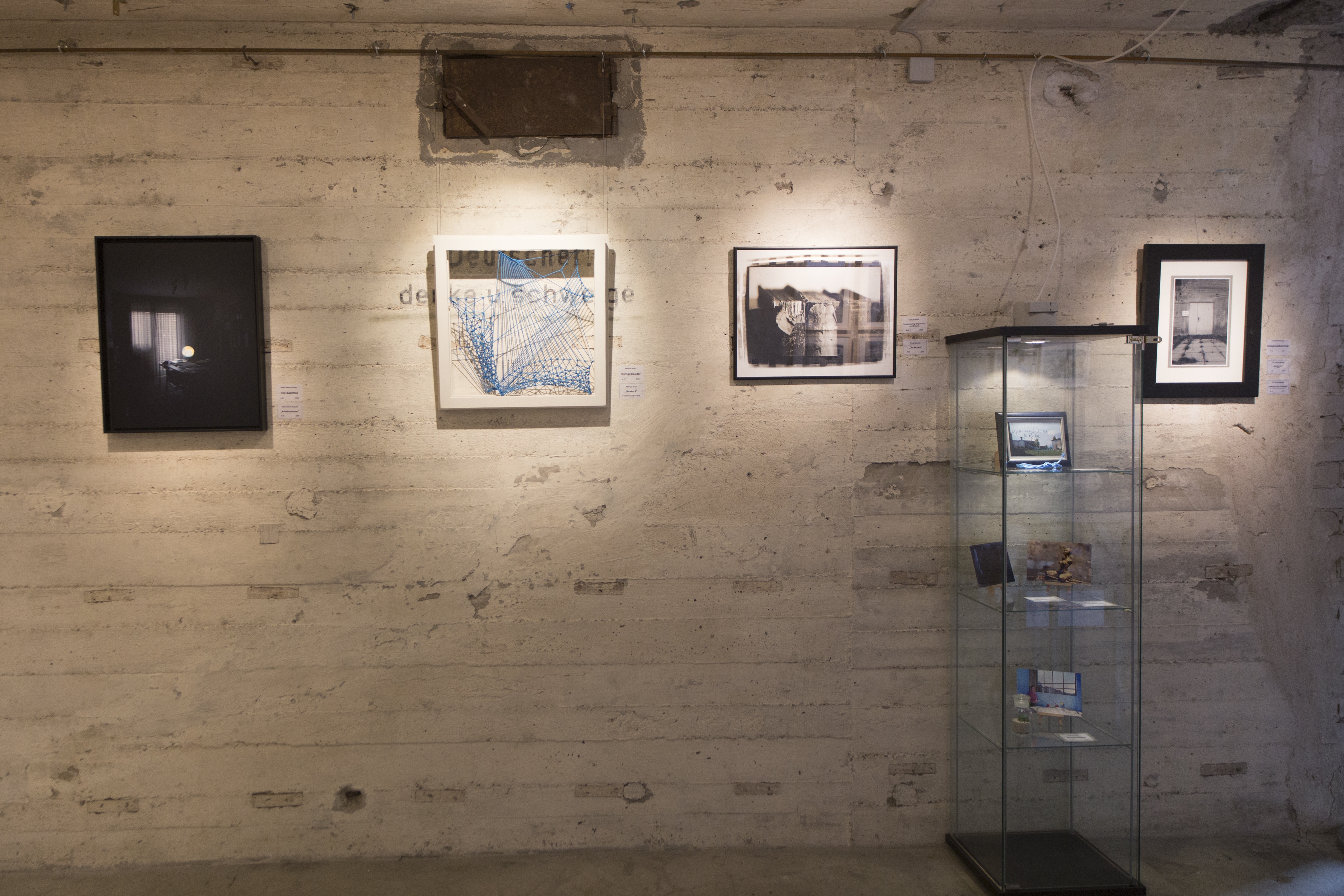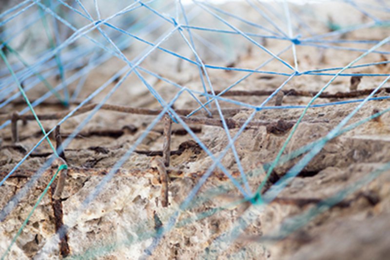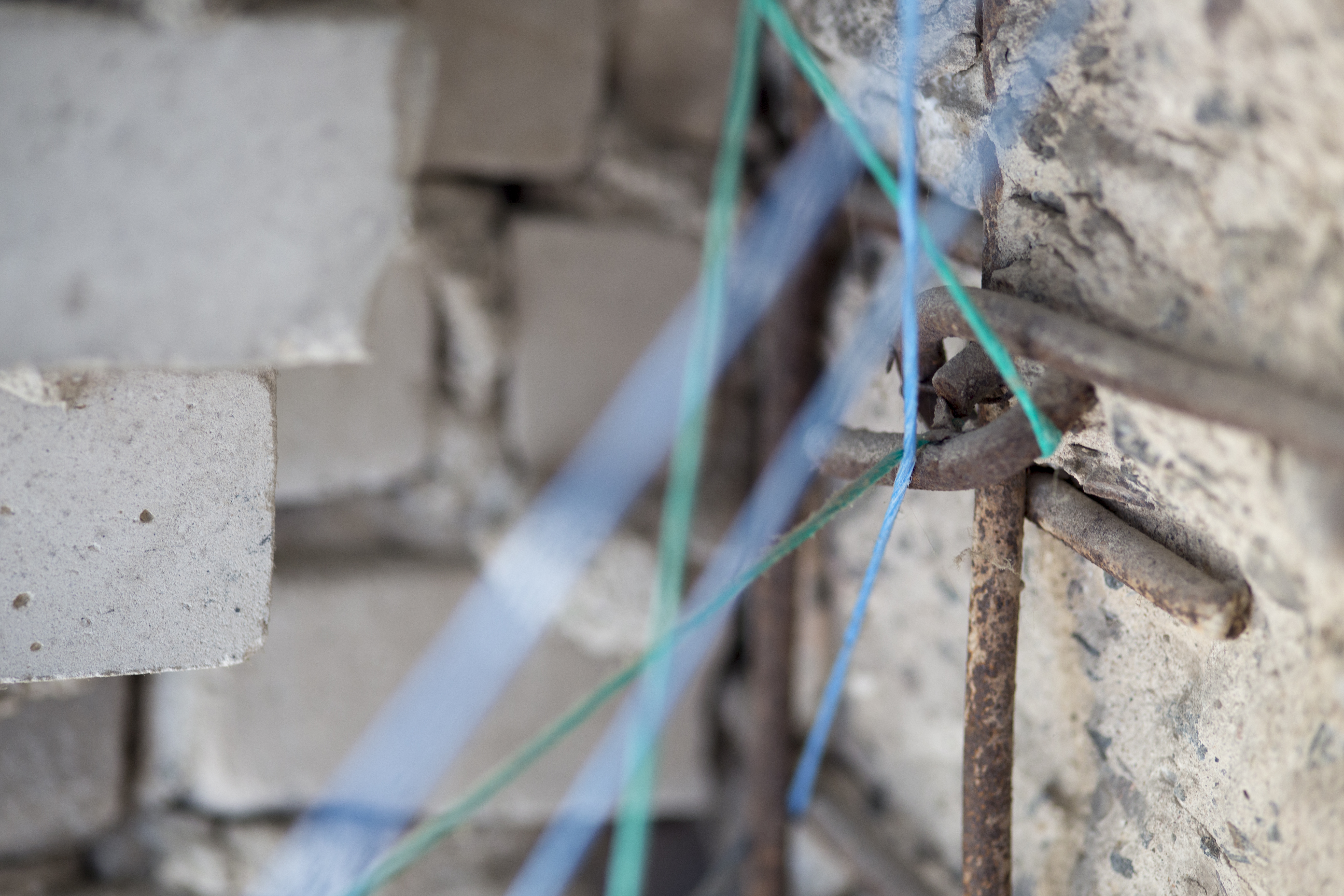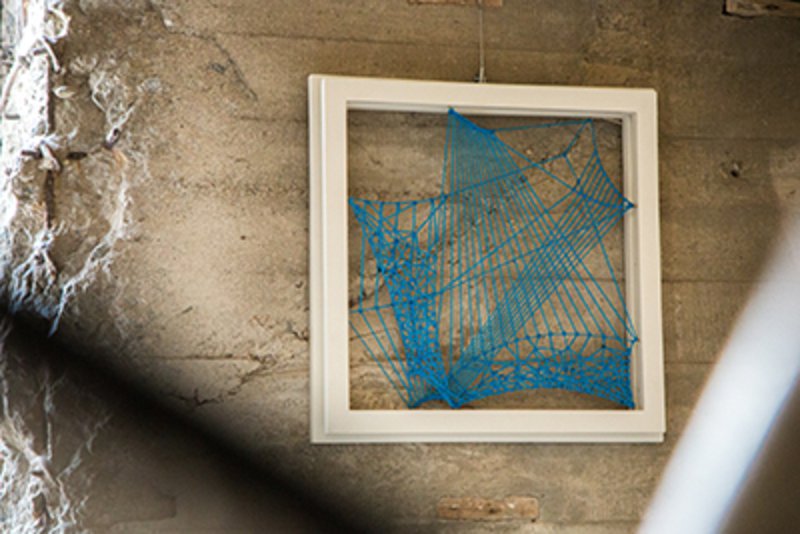 Wie ein roter Faden, in diesem Fall jedoch blau oder grün, spinnen sich zwei Fadenkonstrukte von Mathias Wolf durch den Bunker-D. Seine aus Erntegarn bestehenden Installationen sind nicht nur in Deutschland, sondern auch in den USA bekannt. Mit einfachem Material und fester Knüpfung schafft Wolf Werke, die an Spinnennetze erinnern. Alles hängt miteinander zusammen –wird nur ein Faden gelockert, fällt das Konstrukt in sich zusammen.