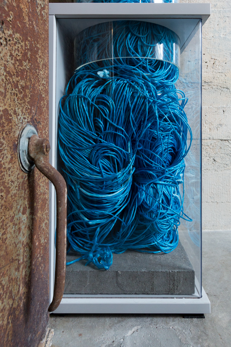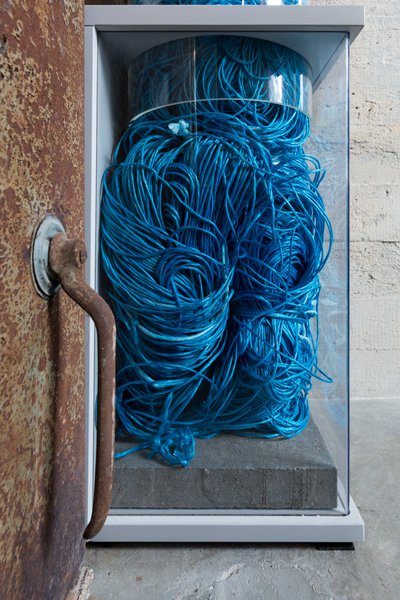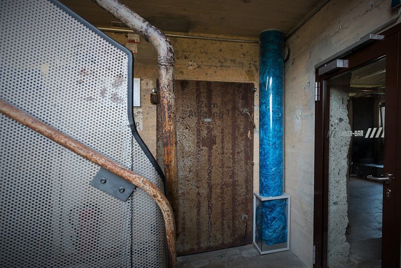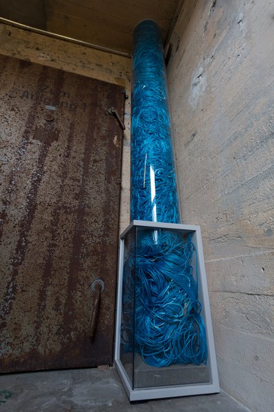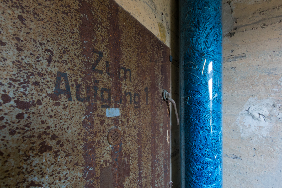 Im Treppenhaus des Bunker-D spannt sich vom Boden bis zu Decke des Flures ein Glasrohr, randvoll ordentlich zusammengewickelter blauer Fäden. Das Werk konserviert auf diese Art die temporäre Fadeninstallation von Mathias Wolf und Jens Fischer aus dem Jahr 2017, als die blauen Fäden eine Verbindung zwischen dem Verwaltungsgebäude, dem Computermuseum, dem Bunker-D und dem WiSo-Hochhaus mit dem Steinkreis von Ludger Gerdes auf dem Max-Reichpietsch-Platz schufen: