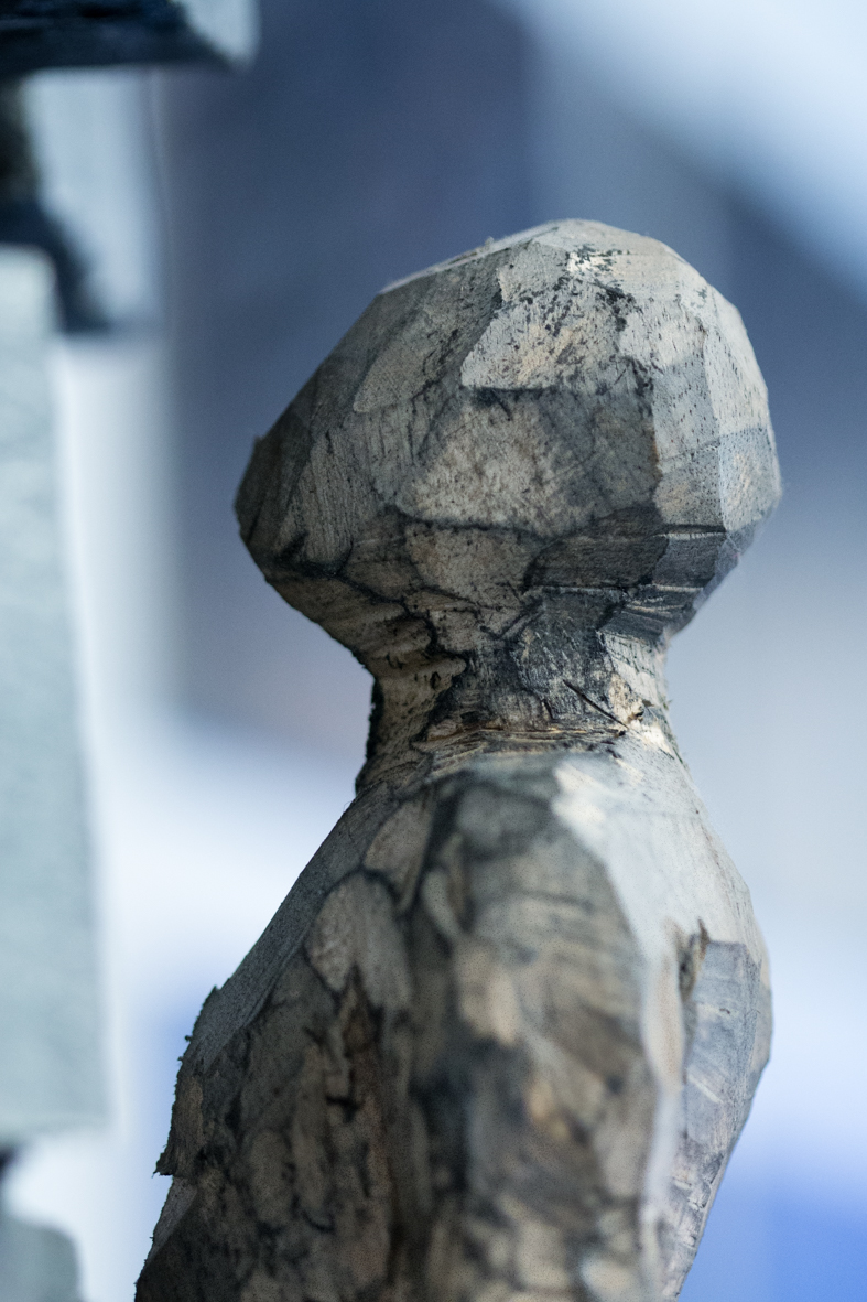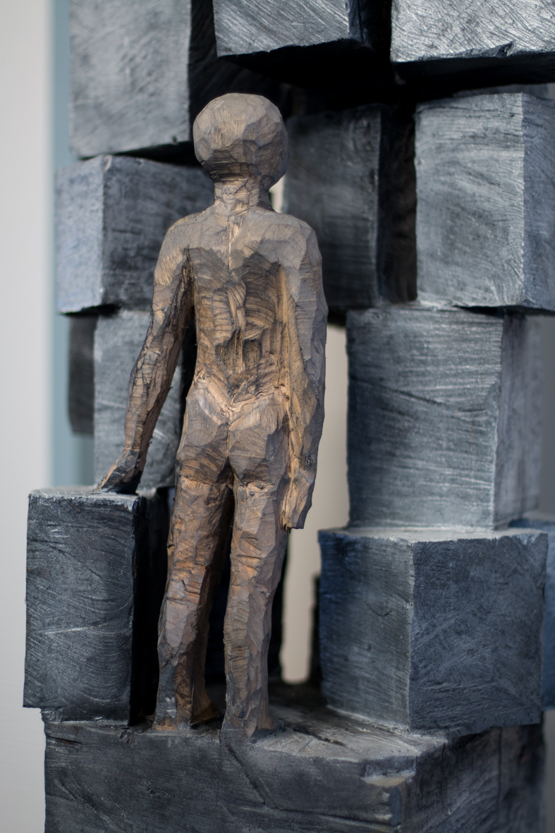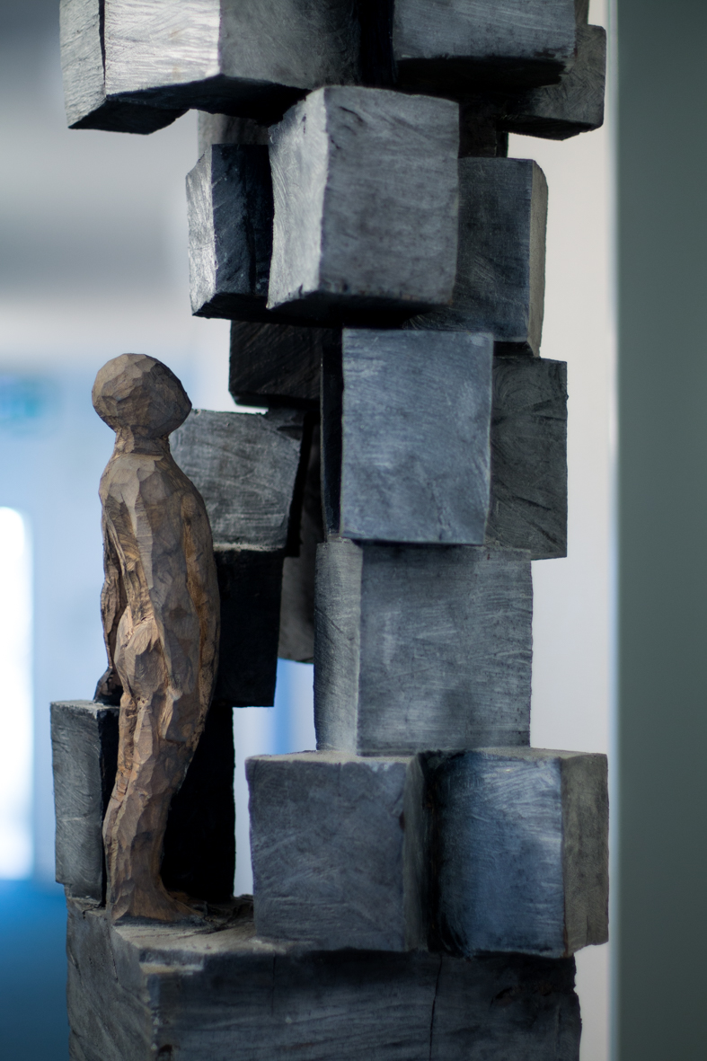 Mit Kettensäge und Schnitzeisen bearbeitete die Kieler Künstlerin das Objekt und gab ihm eine leicht schillernde silberne Farbe. Sie zeigt einen Menschen, der vor einer Konstruktion aus aufgetürmten Klötzen hinauf blickt, der das überdimensionale Konstrukt von unten bestaunt. Nach oben werden die Abstände der Klötze größer. Es entsteht ein Ungleichgewicht, das in der Realität das Einstürzen des Turmes bedeuten würde, jedoch hier den Eindruck von Schwerelosigkeit hervorruft.