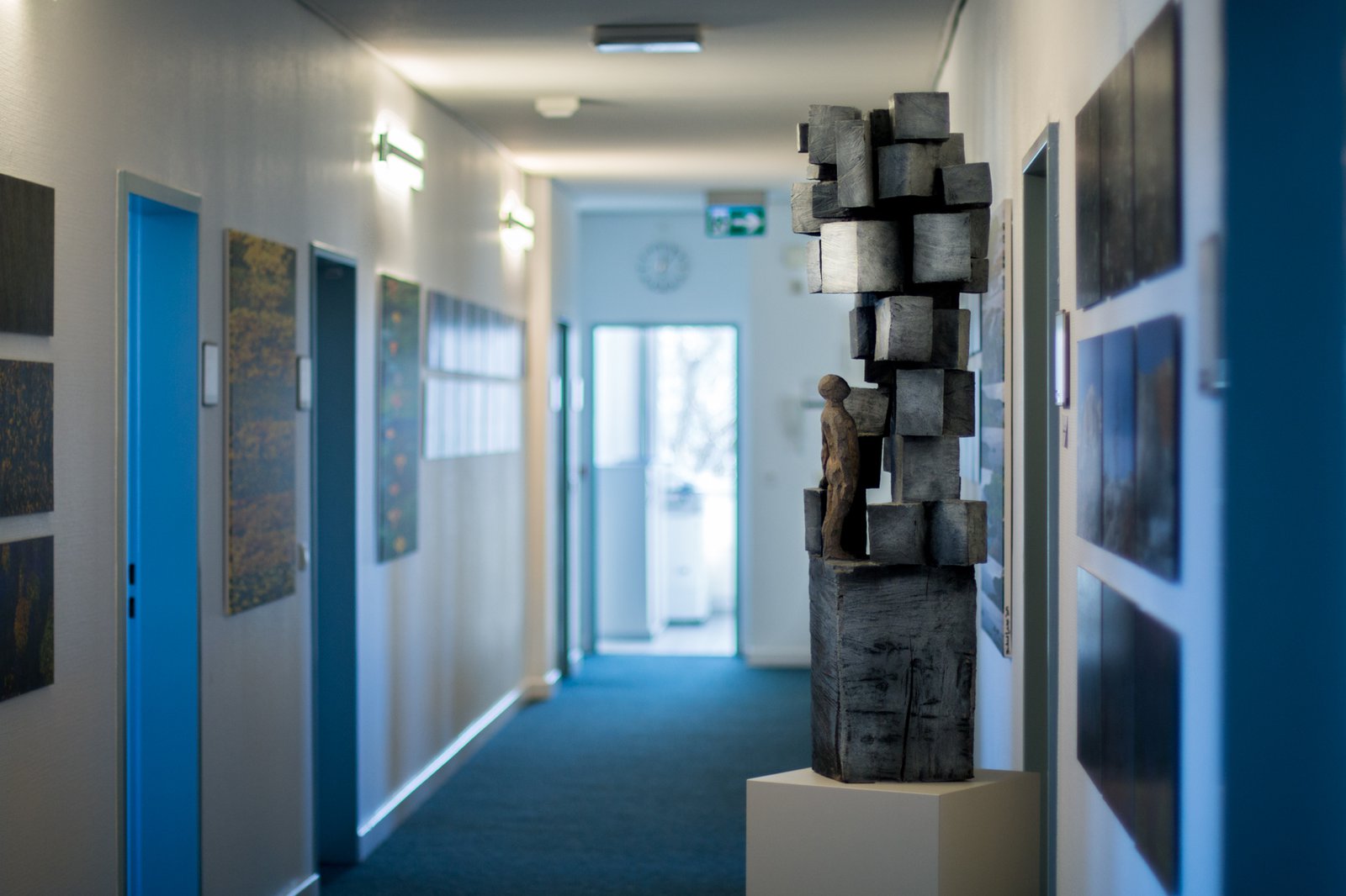 Die aus dem Holz eines Walnussbaums angefertigte Skulptur von Rosa Treß ist nur eine von vielen, die in der Kunstsammlung des Campus der HAW Kiel zu finden ist. Während die großen Skulpturen den Apfelbaumgarten hinter dem Präsidium zu einer Kunstwiese verwandeln, so befindet sich diese Skulptur, in ihrem vergleichbar kleinen Format im 3. OG des Präsidium Gebäudes; sie steht jedoch den großen Arbeiten in nichts nach.
