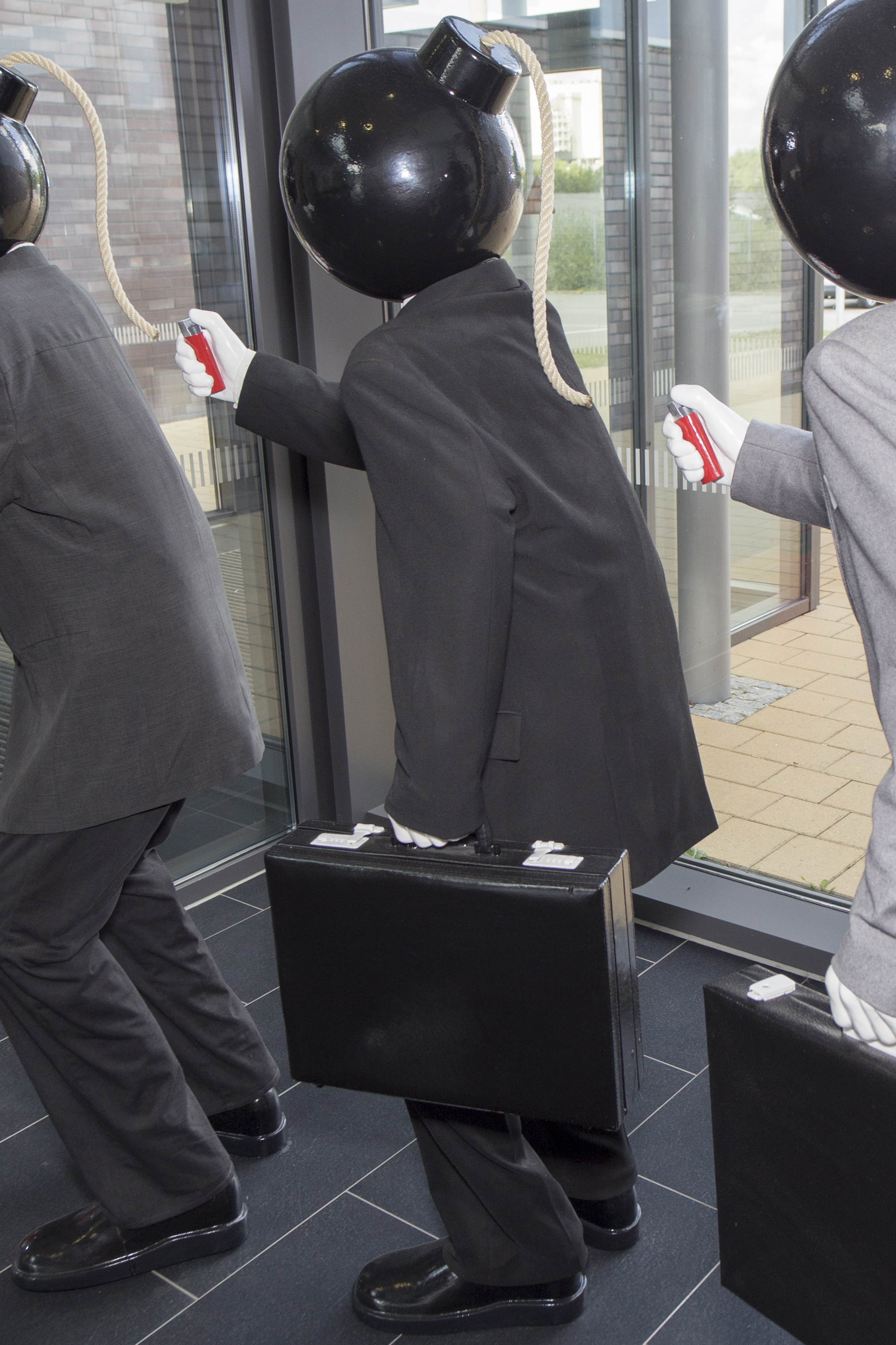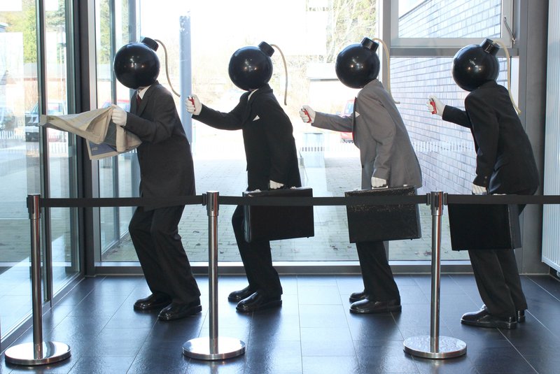 Sascha Kaysers Arbeiten leben von hintergründigem Humor und kritischer Betrachtung der Dinge. So seine vier „Knallköppe“, die nach der Ausstellung „0+2=1“ im Bunker-D von einem Kieler Unternehmen gekauft wurden und der HAW seitdem als Leihgabe zur Verfügung stehen.