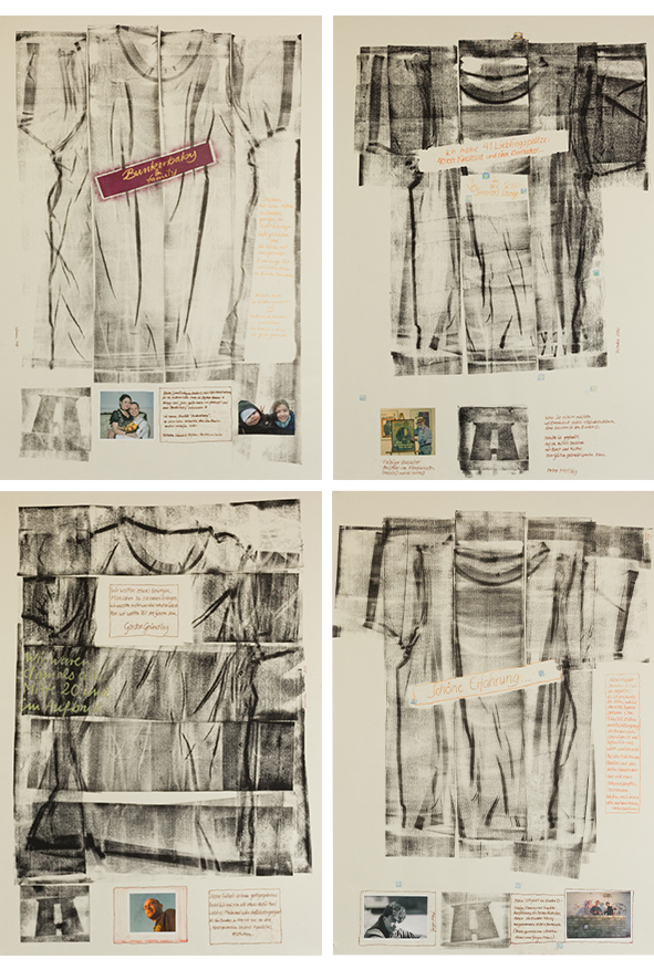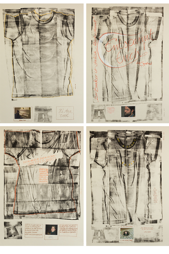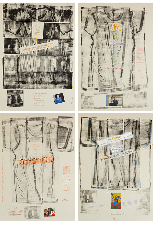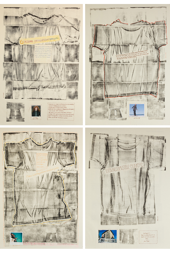 Für ihre Arbeit nutzte die Künstlerin Frontagetechniken auf der Basis von Bunker-T-Shirts und unterstützte diese mit Bildern und Zitaten der Beteiligten, die sie durch einen Austausch mit diesen erhalten hat. Fragen wie "Was habt ihr im Bunker-D gemacht?" und "Habt ihr einen Ratschlag für künftige Austellerinnen, Aussteller und Gäste?" haben gezeigt, dass alle der achtundzwanzig Mitwirkenden eine individuelle Motivation für ihr Engagement und ein unterschiedliches Bild vom Bunker haben. Doch über die Einzigartigkeit dieses Ortes sind sich alle einig.
