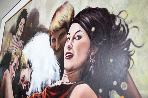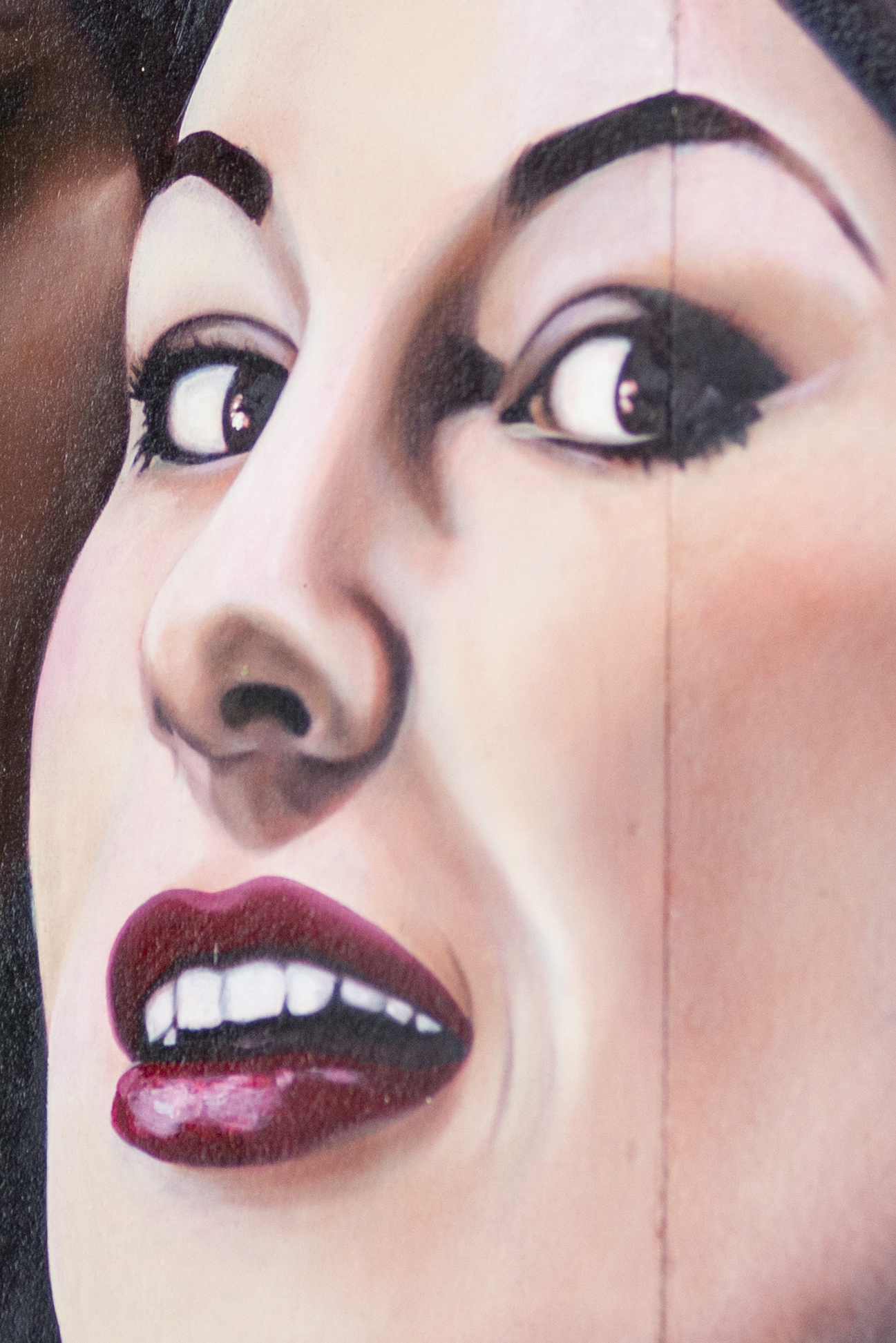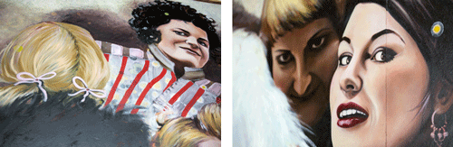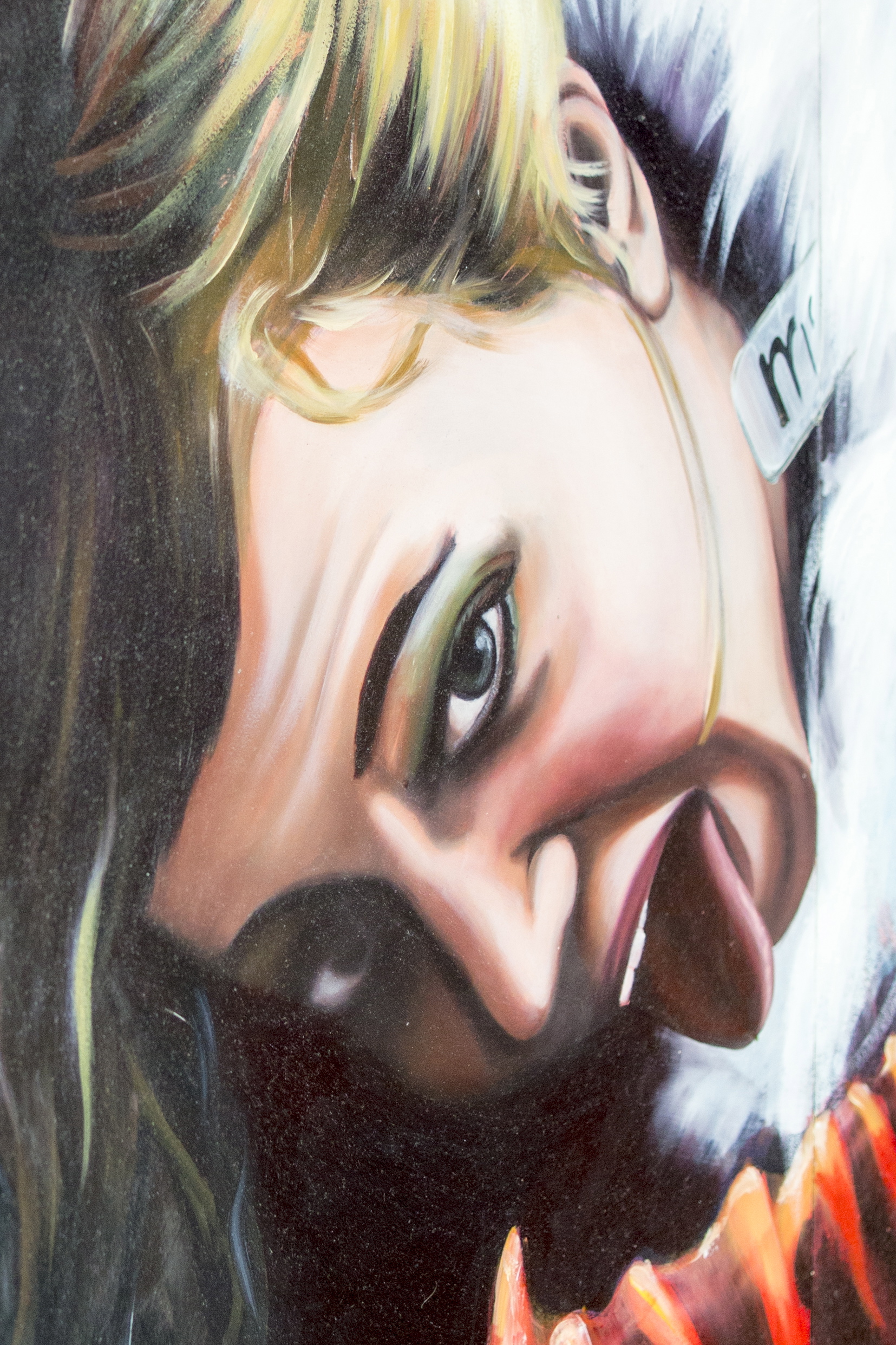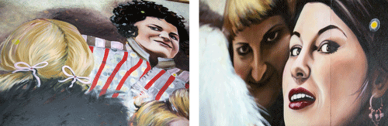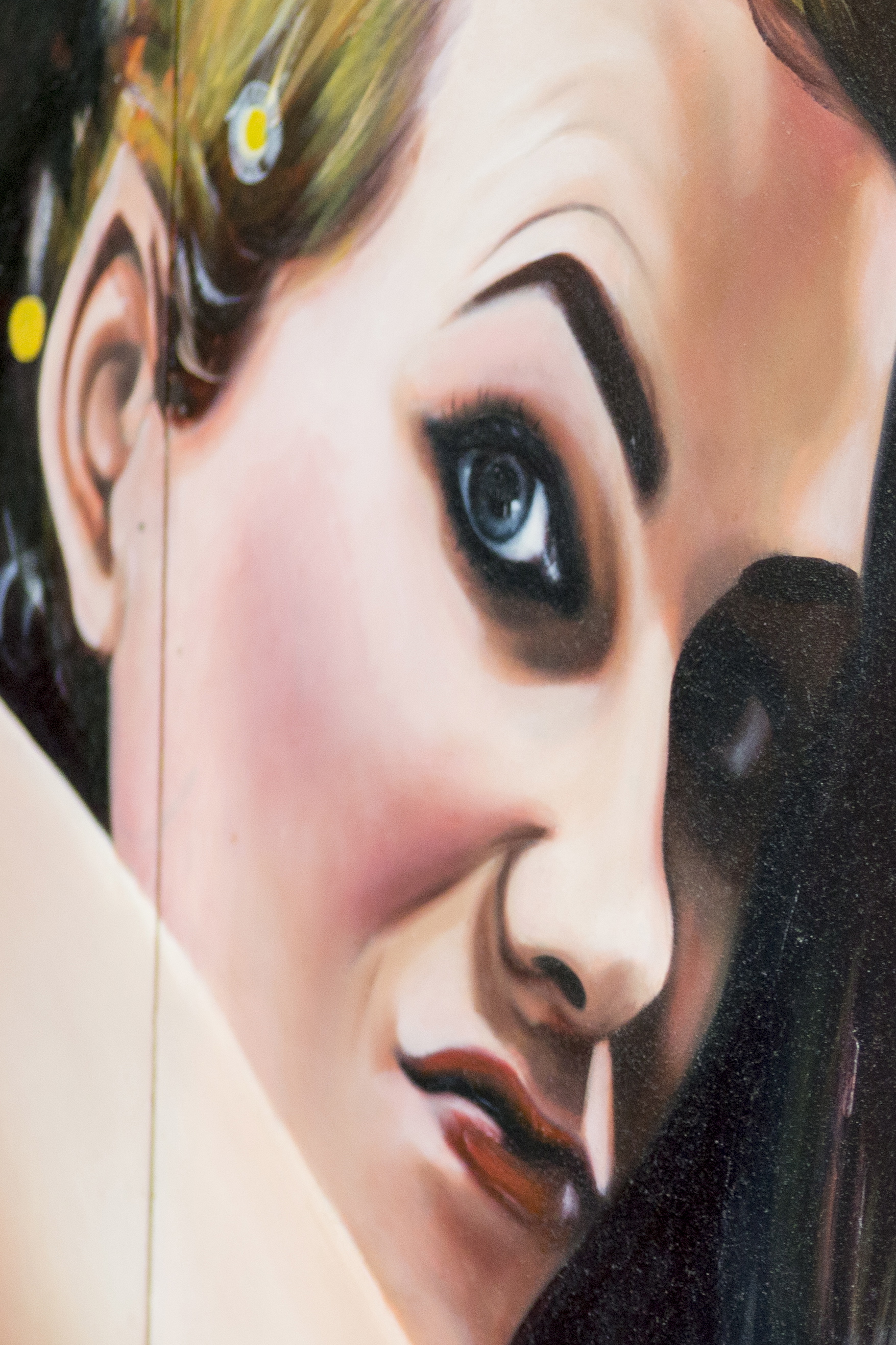 Anna Lena Straubes Malerei dreht sich oft um junge, moderne Frauen und deren Sehnsucht nach Individualität und Weiblichkeit. Diese Themen lassen sich auch bei dem Werk „Kunsttherapie" wiederfinden, deren Blicke Vorbeigehende im großen Hörsaalgebäude fesseln und verfolgen.