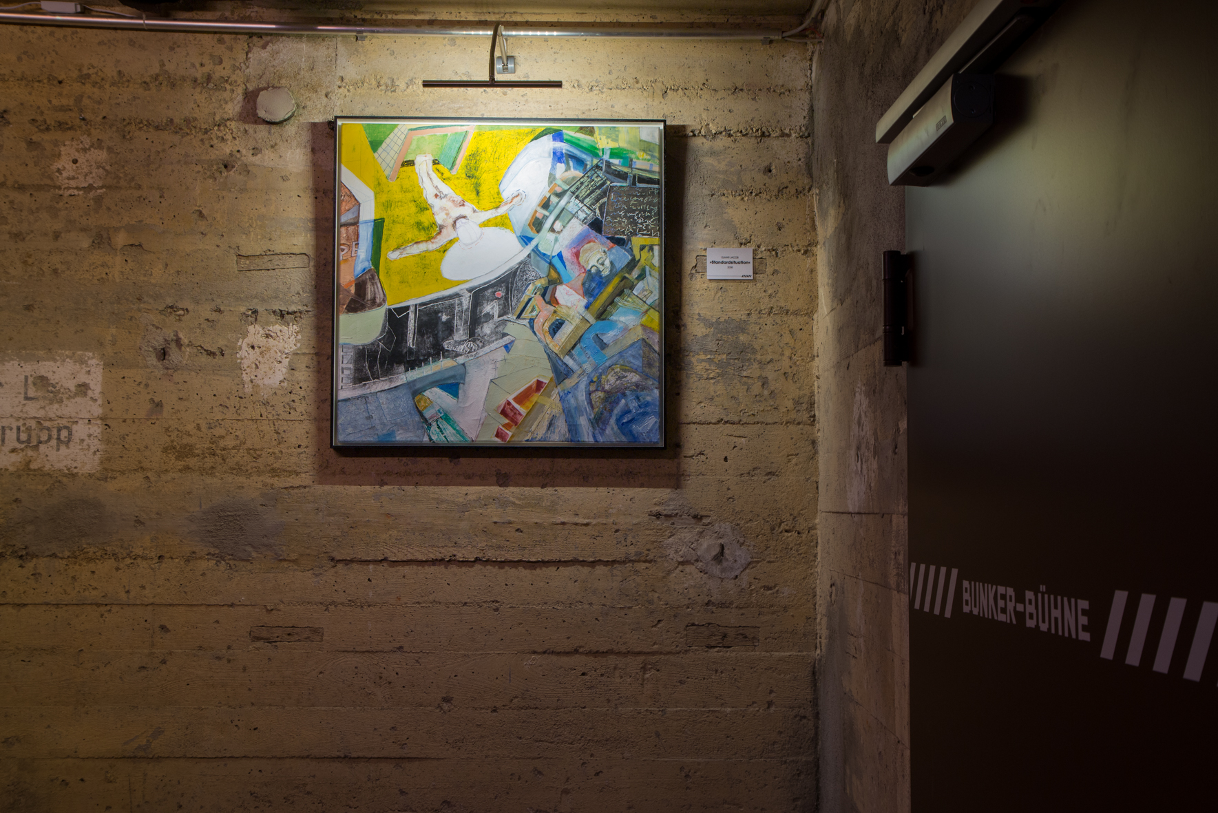 Elmar Jacobs Werk zeigt alles andere als eine Standardsituation. Fast schon surrealisisch und traumhaft vereinen sich unterschiedlichste Formen und Farben. Trotzdem werden sie zu einem großen Ganzen. Ein Torso, ein Kopf und geometrische Figuren bestimmen das in gelb und blau Tönen gehaltene Bild auf Leinwand. Die Elemente sind entstanden aus den persönlichen Erfahrungen von Elmar Jacob. Er drückt mit seiner Kunst seine Inspiration und seine eigenen Erlebnisse aus. Wie durch Gedankensprünge von einem Thema in das nächste, entsteht eine neue, vielschichtige Welt, bei der es kein erkennbares Oben und Unten gibt. Diese Welt scheint widersprüchlich. Der Betrachter soll selbst entscheiden, wie er sie deutet und was er darin sieht.