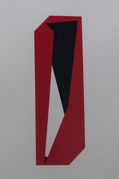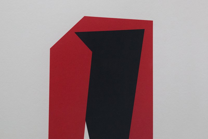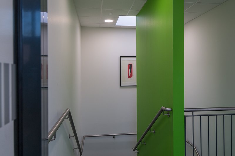 Die Arbeit in typischer Schrader-Manier ist gezeichnet von Kontrasten: Schwarz trifft auf Weiß und Rot. Durch die Hängung des Kunstwerks entsteht ein weiterer Effekt: Im Spiel mit der grellgrünen Wand in der Mitte des Treppenhauses entstehen Kontraste zwischen den Komplementärfarben Grün und Feuerrot.