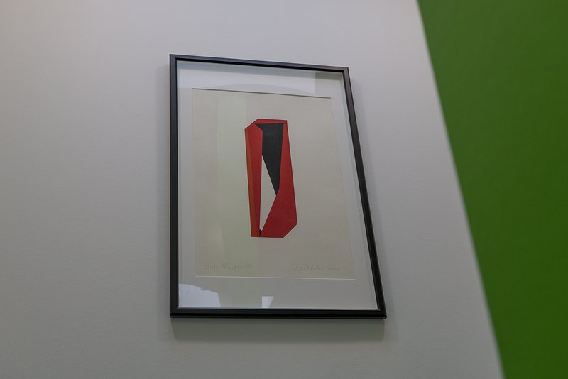 "Cube-Crack", Teil der grafischen Serie "Cube" des Künstlers HD Schrader, hängt zentral im Treppenhaus des Seminargebäudes C22 der HAW Kiel. Der Druck zeigt eine in sich geschlossene geometrische Figur aus feuerrot und schwarz.
