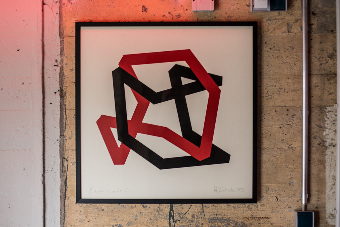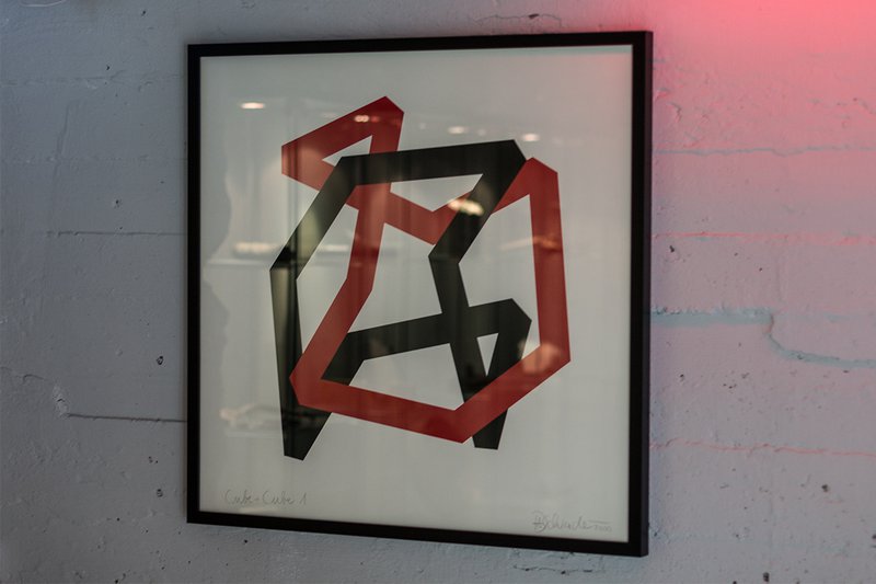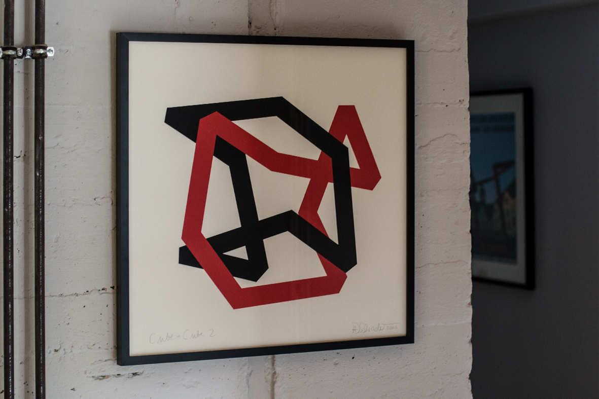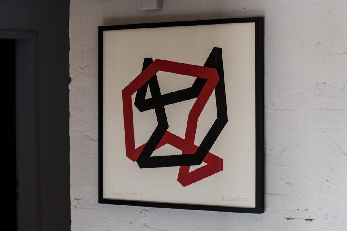 Die Druckserie „Cube+Cube 1-4“ zeigt vier Variationen von aus dem Würfel entstandenen Gebilden, die jeweils miteinander verbunden sind. Einen Kontrast bildet die Farbgebung der Formpaare; schwarz und rot auf weißem Grund.
