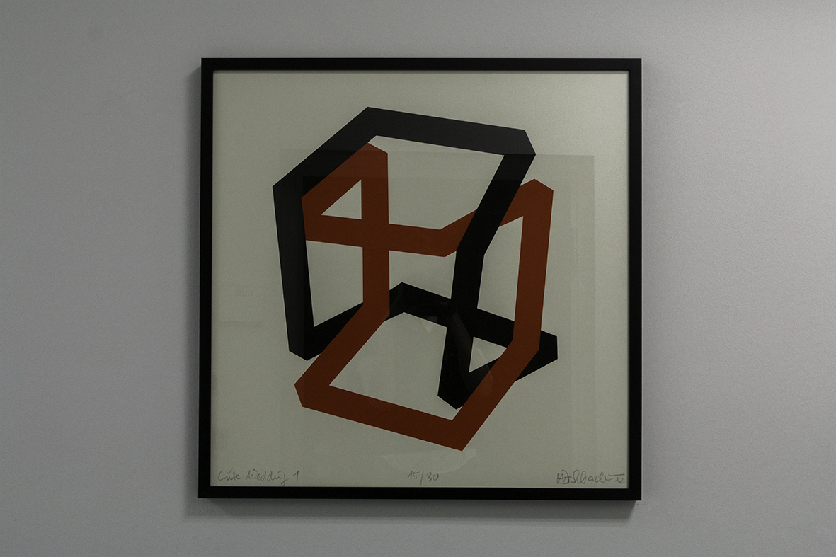 Die Drucke "Cube Wedding 1“ und "Cube Wedding 2“ zeigen jeweils zwei geometrische, in sich geschlossene Gebilde in rot und schwarz, die – wie das Symbol der Eheringe – miteinander verschlossen sind. Durch die Reduktion auf zwei Farben vor weißem Grund erfolgt eine Konzentration auf die aus dem Würfel entstandenen Figuren.