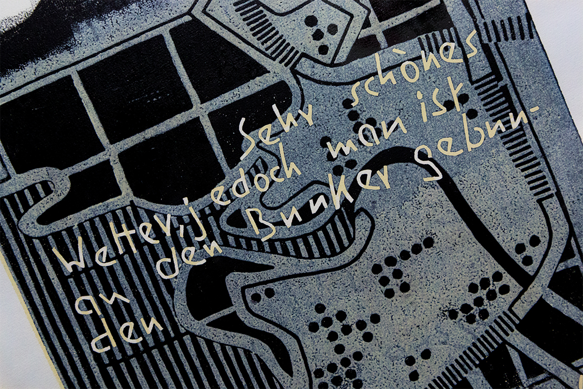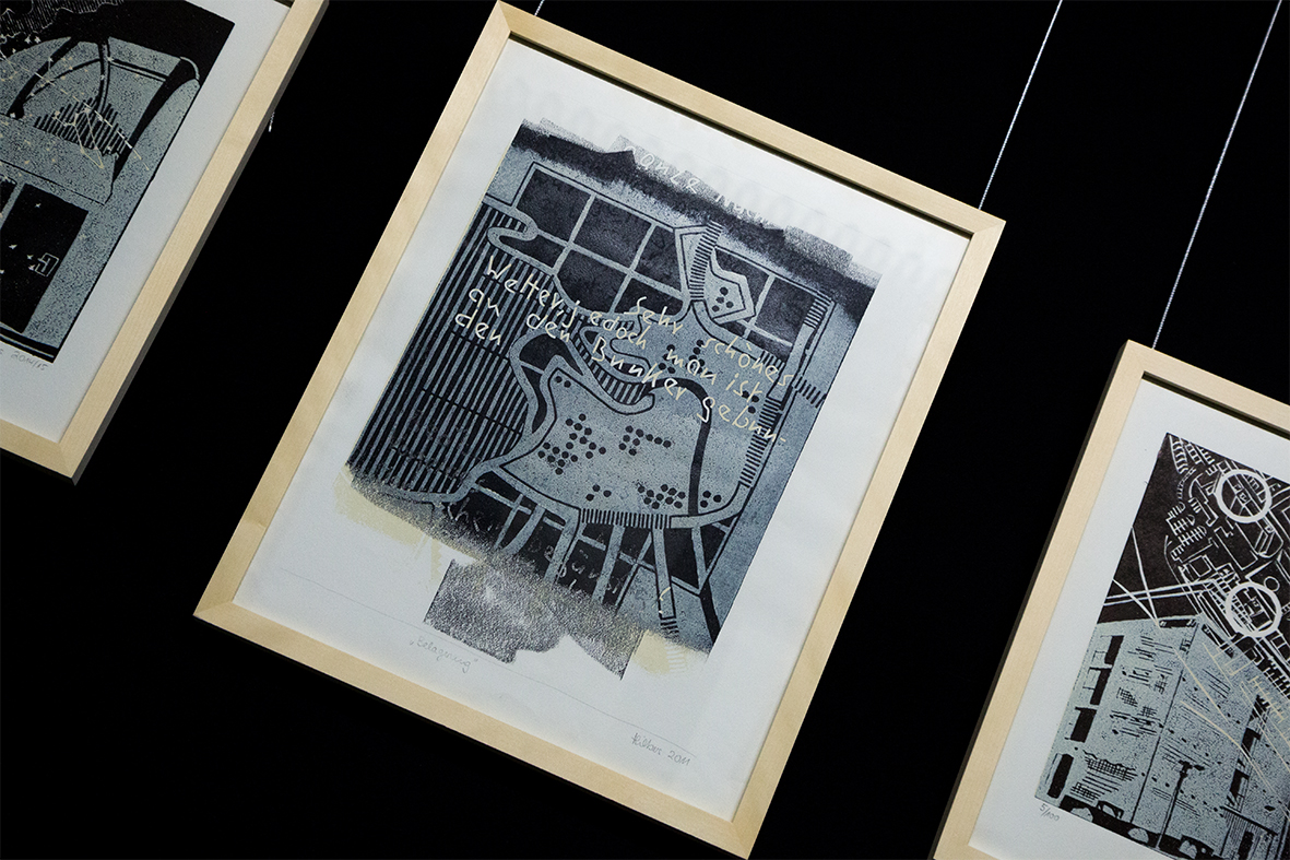 In St. Petersburg erinnert eine Gedenkstätte an die Opfer der Belagerung der Stadt im Zweiten Weltkrieg. Die Kieler studierte Malerin und Grafikerin Karin Hilbers setzte sich künstlerisch mit Tagebucheintragungen der Eingeschlossenen auseinander und gestaltete die Grafik "Belagerung" im Linolschnittverfahren anlässlich ihrer Ausstellung im Jahr 2011 im Bunker-D. Das Zitat eines Soldaten "Sehr schönes Wetter, jedoch man ist an den Bunker gebunden" ist über einen Lageplan des heutigen Campus mit dem Bunker-D und der Schwentinemündung geschrieben. Die Tagebuchaufzeichnung über das Bedauern im Bunker ausharren zu müssen, war auch der Titel der Schau. Nach der Ausstellung wurde das Werk Bestandteil der Sammlung CampusKunst-D und ist mit zwei anderen Grafiken von Karin Hilbers dauerhaft im Bunker-D zu sehen.