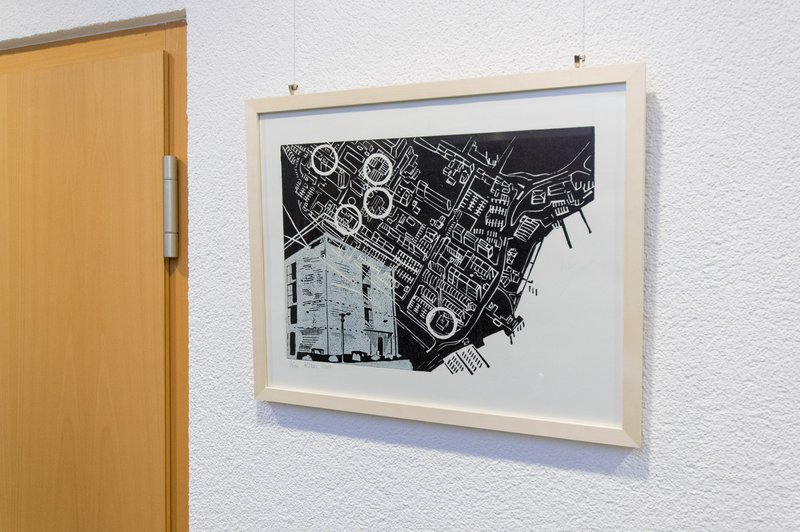 Seit dem Jahr 2014 hängt der Linolschnitt "Campus Bunker-D" im Foyer des Mediendoms. Als helles Negativmuster ist der Plan des Fachhoschulcampus und der Grundriss des Bunker-D in dunkles Linoleum geschnitten.